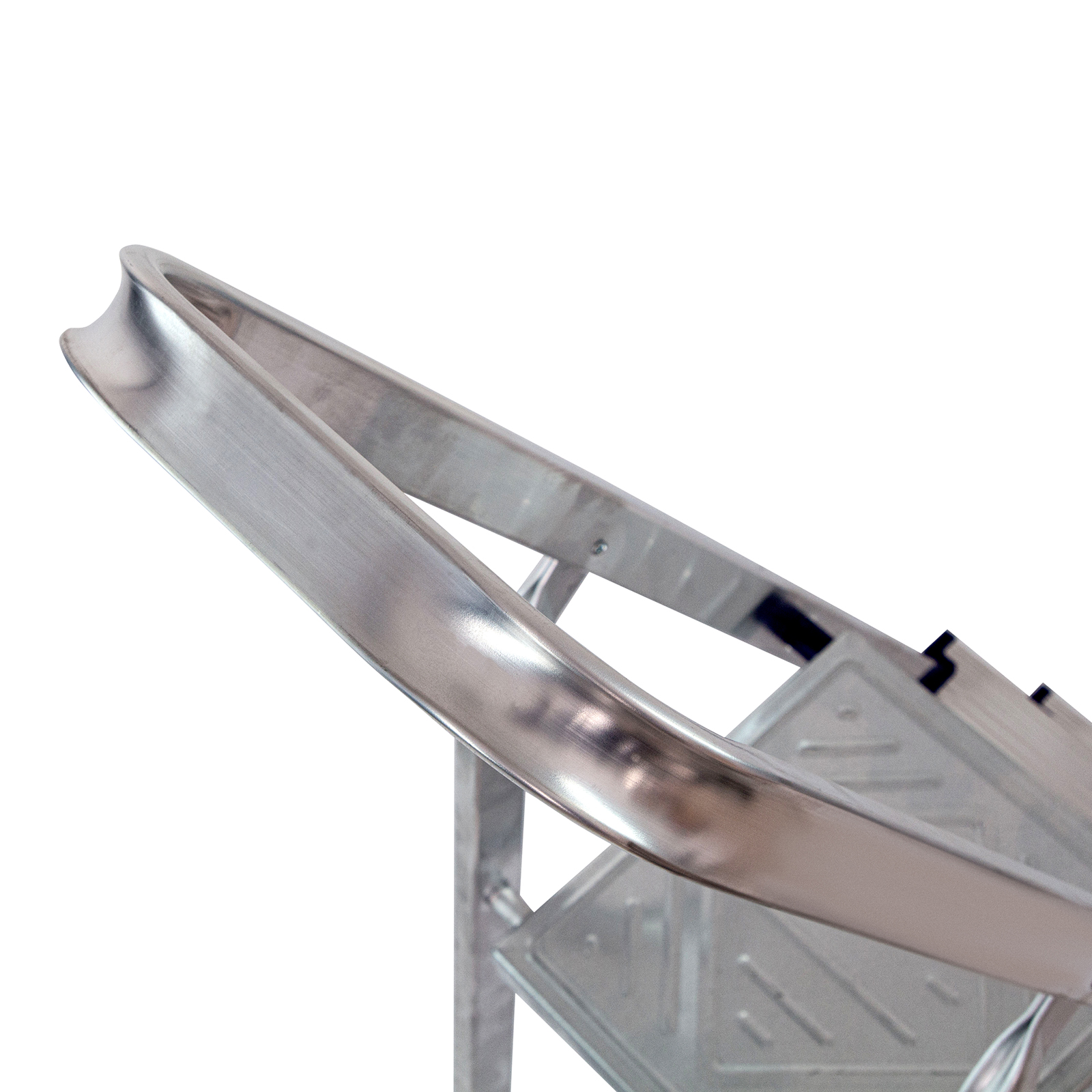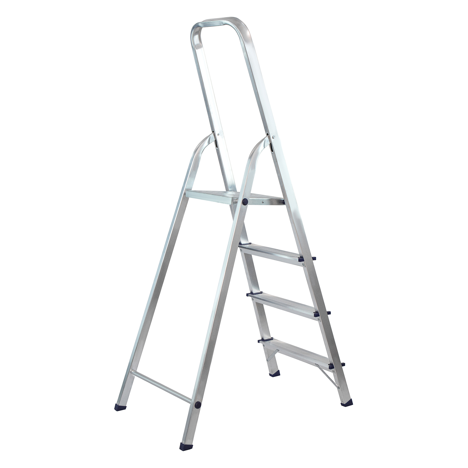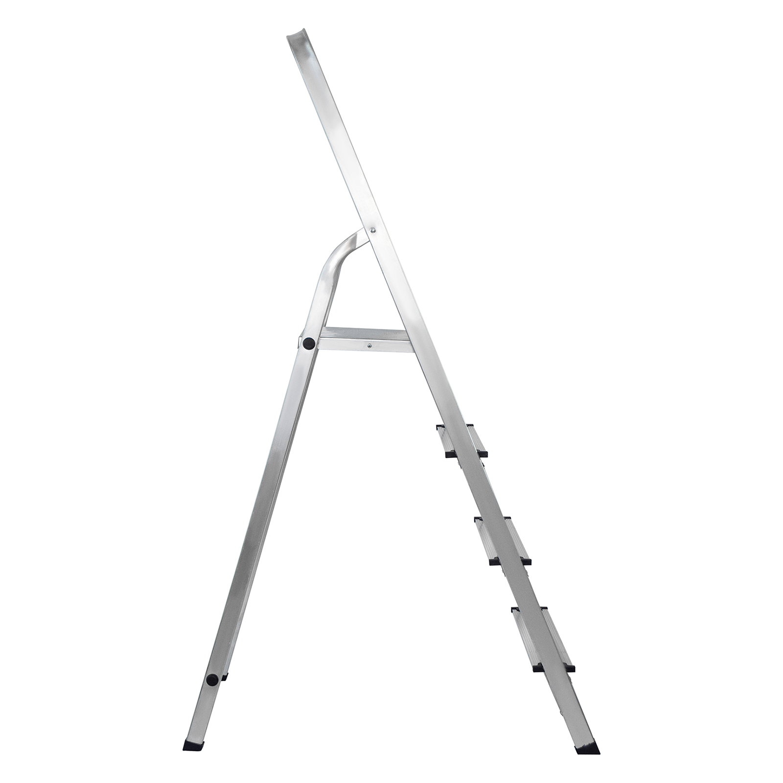 - Надежность — рама из прямоугольного алюминиевого профиля выдерживает нагрузку до 150 кг, широкие ступени закреплены заклепками.