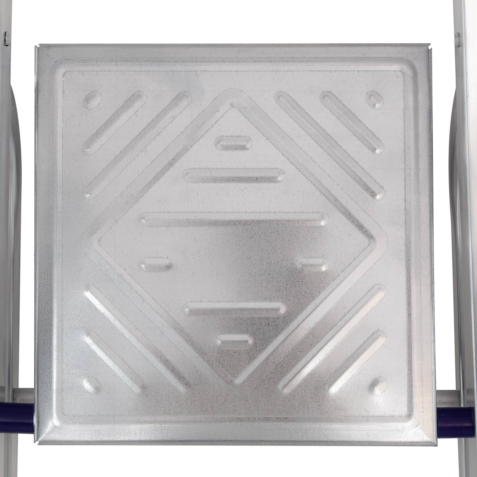 - Продуманная конструкция — стальная рабочая площадка с зацепами надежно фиксирует стремянку в разложенном положении.
