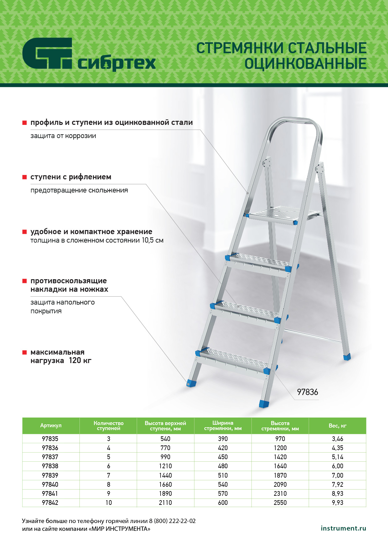 Стальная оцинкованная стремянка Сибртех 97835 с 3 ступенями позволяет повесить полку, картину или шкафчик, достать нужный предмет и решить другие задачи, для которых требуется доступ к предметам на высоте. Рама и ступени из стального профиля выдерживают вес до 120 кг. Расстояние от опорной поверхности до площадки составляет 54 см, при среднем росте пользователя 170 см рабочая высота лестницы — 254 см. Необходимо соблюдать технику безопасности: размещать стремянку только на ровной плоскости и не использовать ее для работы с дрелью, шуруповертом и другим электроинструментом.