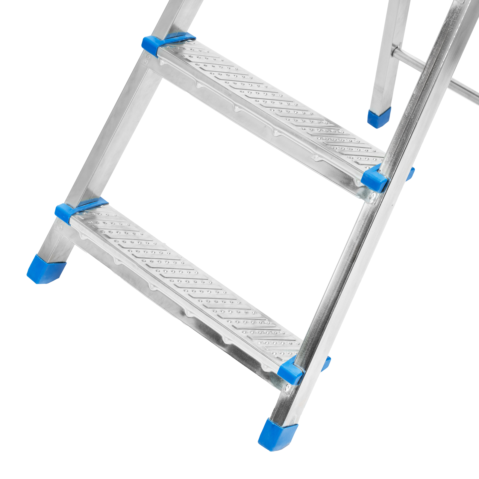 - Простая установка — на верхней площадке предусмотрены специальные зацепы для фиксации стремянки в разложенном состоянии.