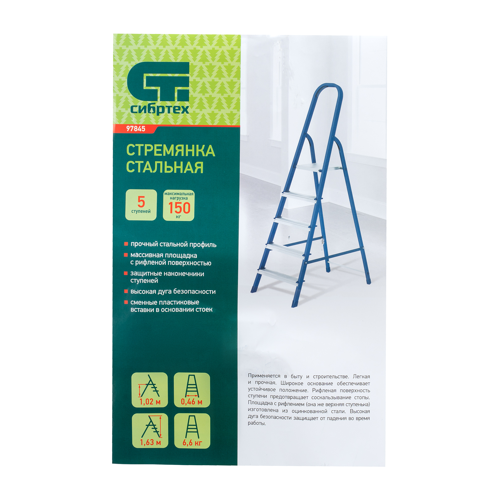 Стремянка стальная Сибртех 97845 с 5 ступенями облегчает выполнение ремонтных, отделочных, а также различных бытовых работ на высоте, превышающей человеческий рост. Площадка находится на высоте 101,5 см от опорной поверхности, рабочая высота стремянки составляет 301,5 см (при среднем росте пользователя 170 см). Высокая дуга безопасности обеспечивает удобную эксплуатацию. Стремянка пригодится дома и на даче.
