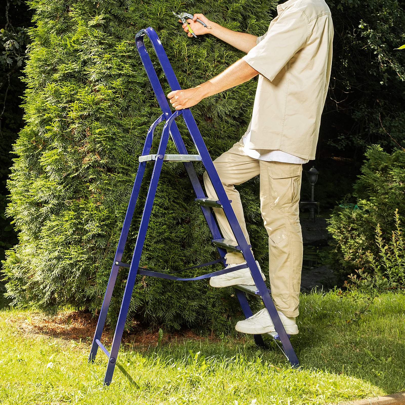 Для обеспечения устойчивости лестницу устанавливают на ровную поверхность, использование электроинструмента во время работы не допускается.