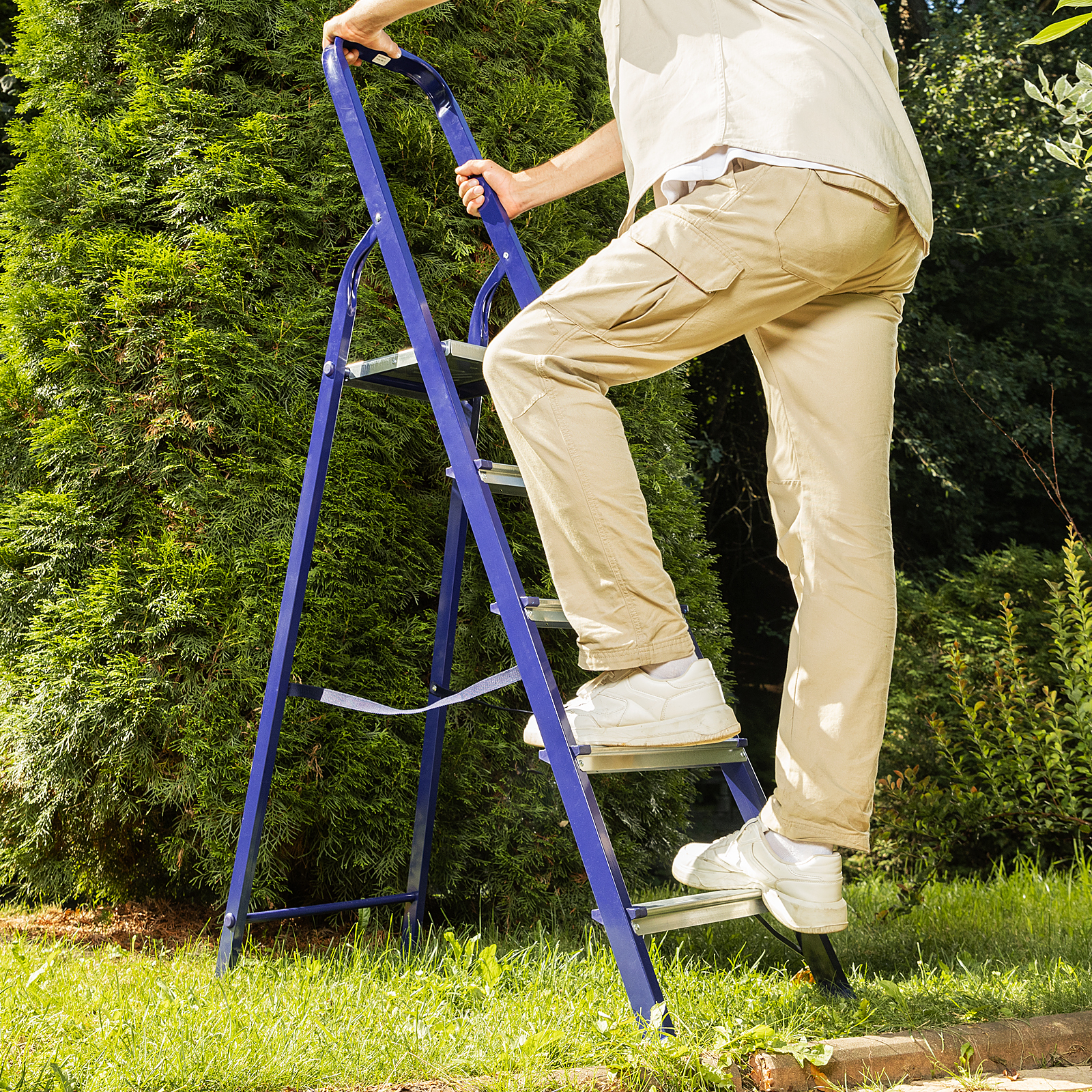 - Повышенная прочность — рама и ступеньки изготовлены из стали и выдерживают нагрузку до 150 кг.