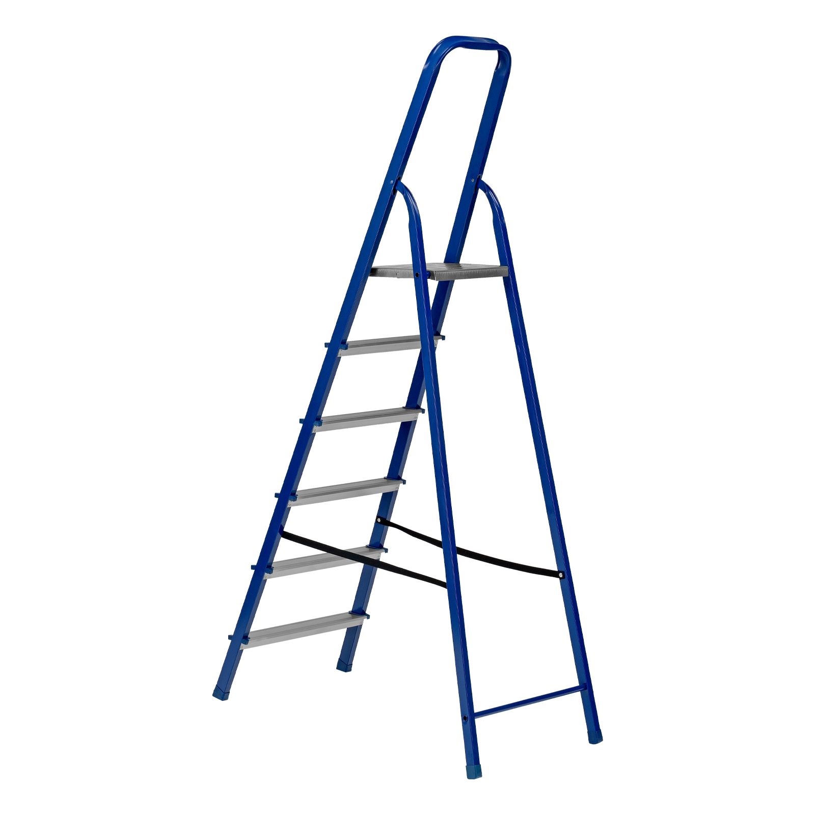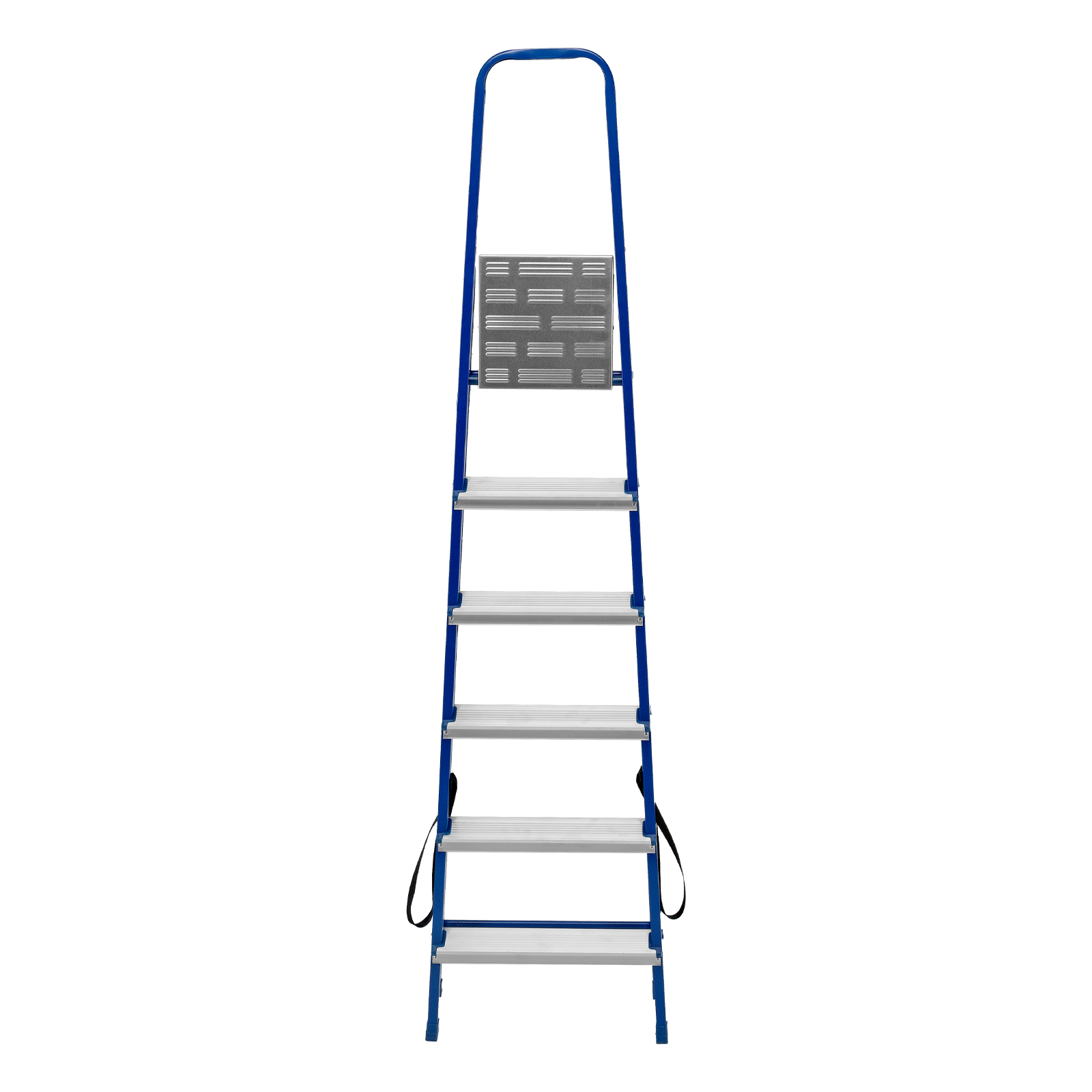 Стремянка Сибртех 97956 со стальным профилем и 6 ступенями, 5 из которых алюминиевые, упрощает доступ к предметам, расположенным на антресолях, шкафах, высоких полках. Также будет полезна для проведения отделочных и монтажных работ. Лестница обладает высокой прочностью при весе 6,8 кг и выдерживает нагрузку до 150 кг. Площадка находится на высоте 123 см от опорной поверхности, рабочая высота стремянки составляет 323 см (при среднем росте пользователя 170 см).