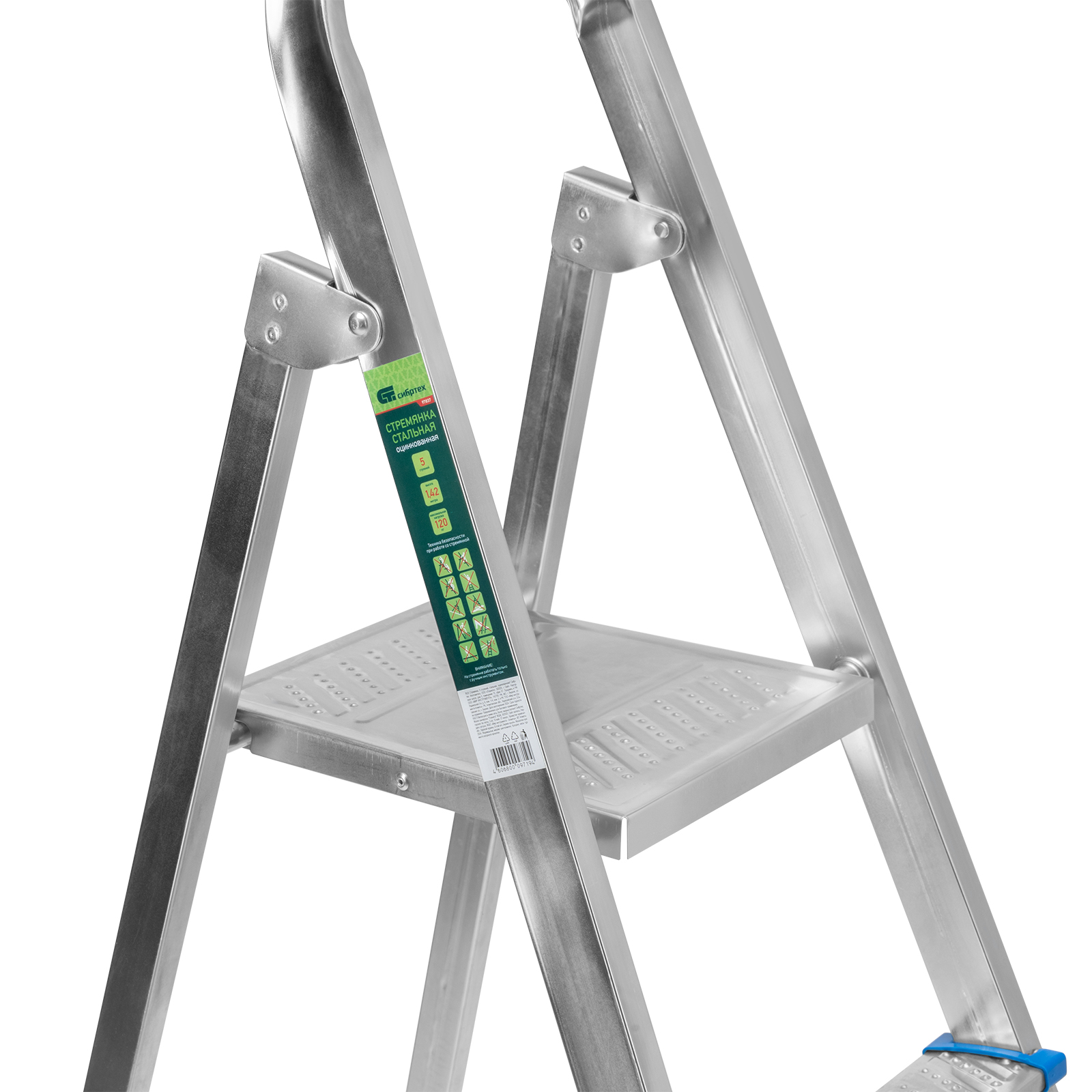 Стальная оцинкованная стремянка Сибртех 97840 с 8 ступенями позволяет выполнять ремонтные и садовые работы, для которых требуется доступ к предметам на высоте. Рама и ступени из стального профиля выдерживают вес до 120 кг. Расстояние от опорной поверхности до площадки составляет 166 см, при среднем росте пользователя 170 см рабочая высота лестницы — 366 см. Необходимо соблюдать технику безопасности: размещать стремянку только на ровной плоскости и не использовать ее для работы с дрелью, шуруповертом и другим электроинструментом.