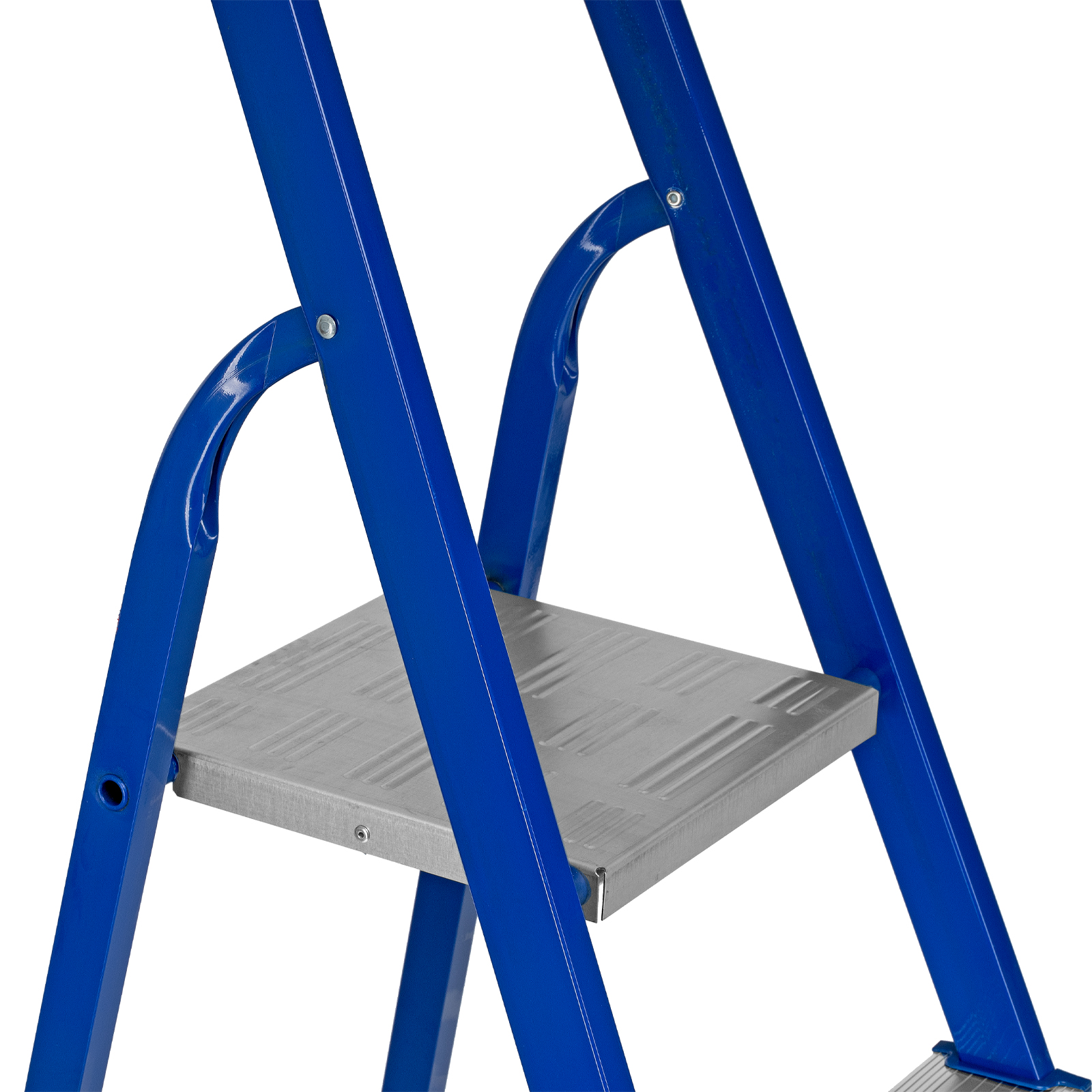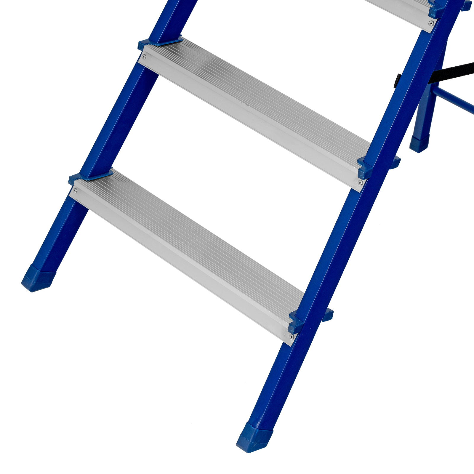 - Надежность — рама изготовлена из профилированной стали, стальная верхняя площадка с зацепами прочно фиксирует стремянку в рабочем положении, страховочные ленты придают дополнительную прочность конструкции.