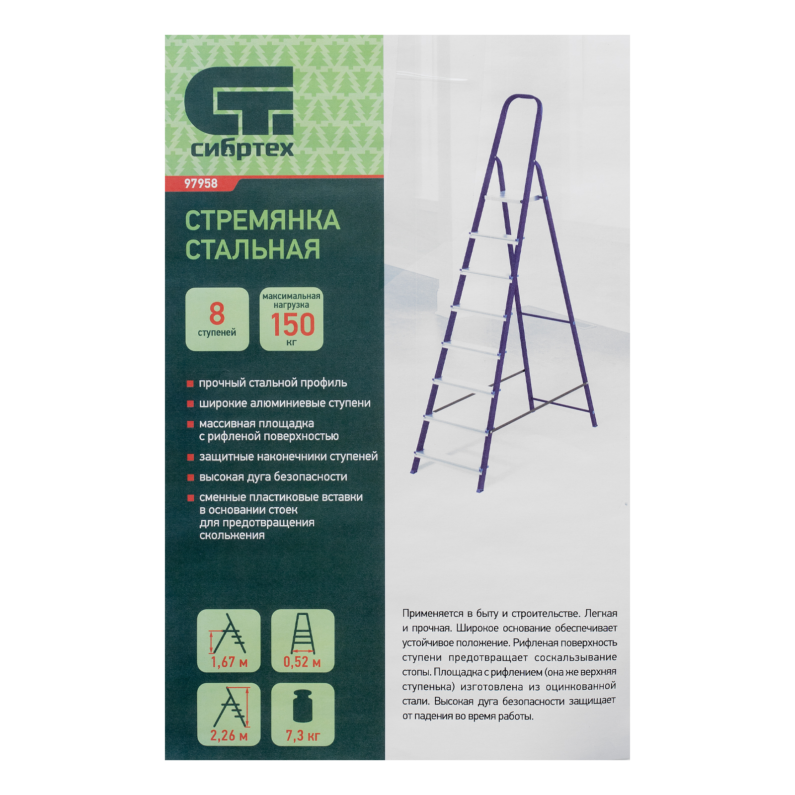 Стремянка Сибртех 97958 со стальным профилем и 8 ступенями, 7 из которых алюминиевые, упрощает доступ к предметам, расположенным на антресолях, шкафах, высоких полках. Также будет полезна для проведения отделочных и монтажных работ. Лестница обладает высокой прочностью при весе 8,5 кг и выдерживает нагрузку до 150 кг. Площадка находится на высоте 166,6 см от опорной поверхности, рабочая высота стремянки составляет 366,6 см (при среднем росте пользователя 170 см).