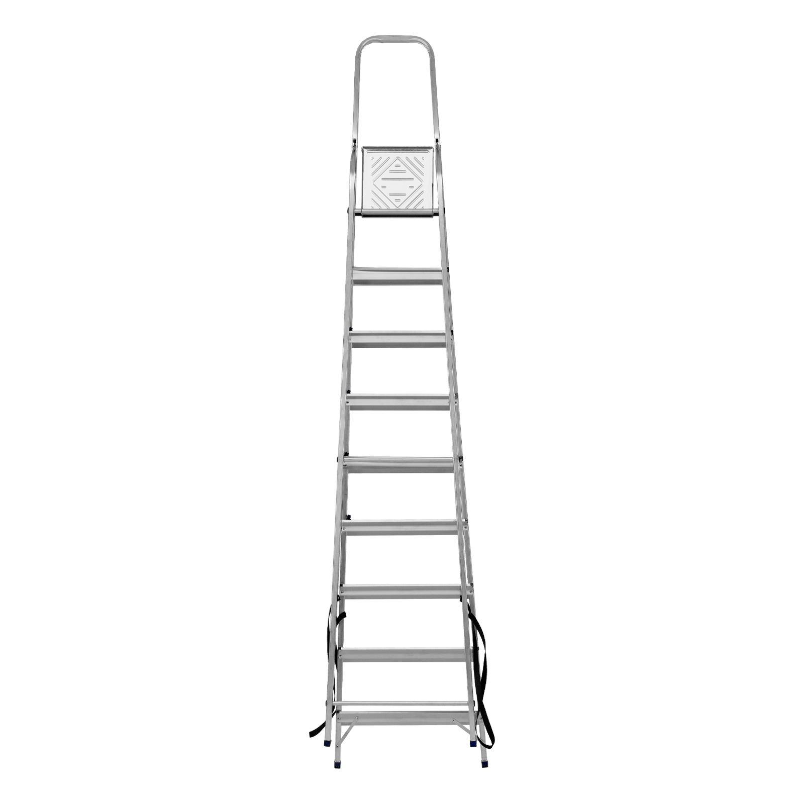 - Продуманная конструкция — стальная рабочая площадка с зацепами надежно фиксирует стремянку в разложенном положении.