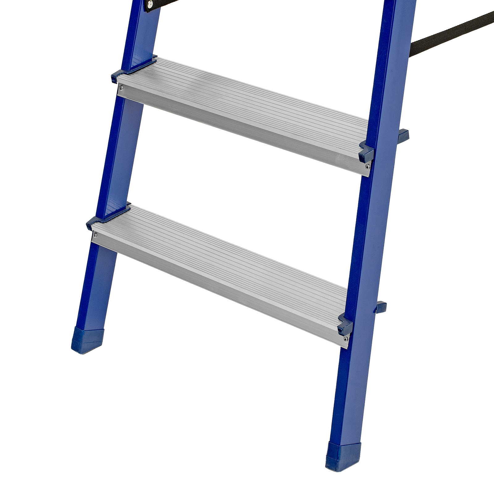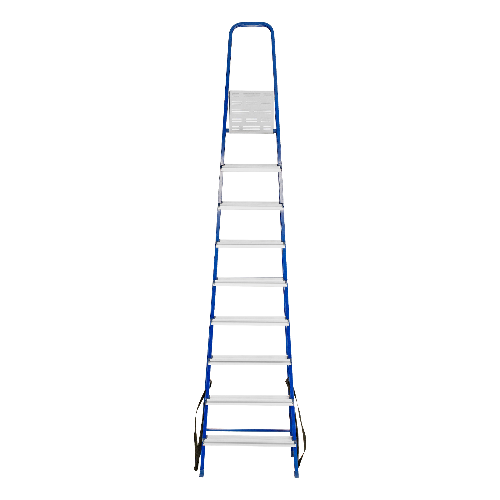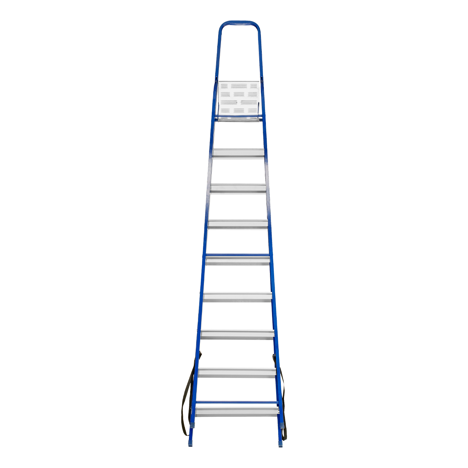 - Надежность — рама изготовлена из профилированной стали, стальная верхняя площадка с зацепами прочно фиксирует стремянку в рабочем положении, страховочные ленты придают дополнительную прочность конструкции.
