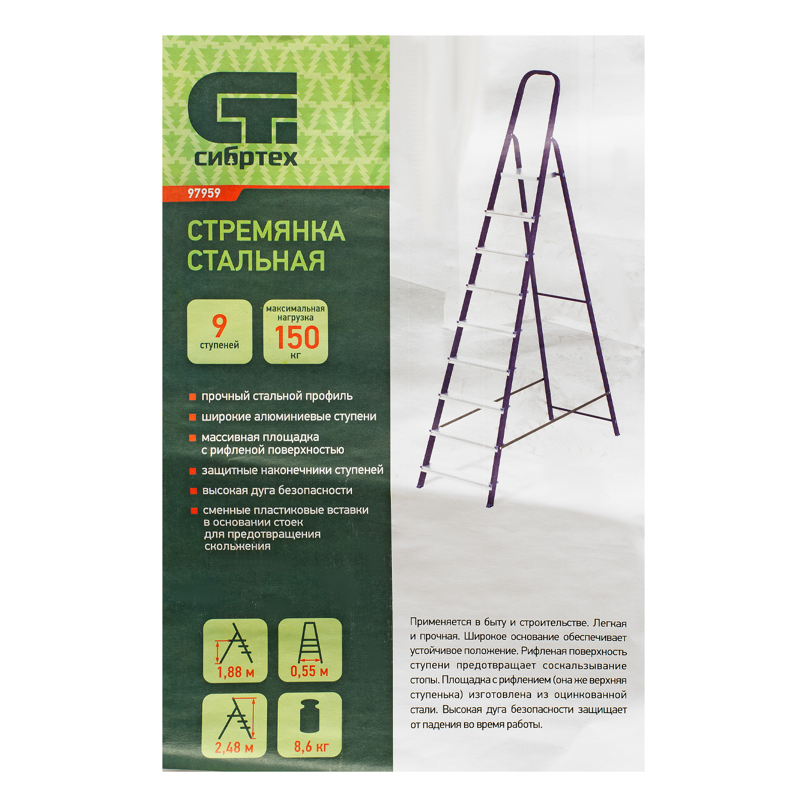 Стремянка Сибртех 97959 со стальным профилем и 9 ступенями, 8 из которых алюминиевые, упрощает доступ к предметам, расположенным на антресолях, шкафах, высоких полках. Также будет полезна для проведения отделочных и монтажных работ. Лестница обладает высокой прочностью при весе 9,3 кг и выдерживает нагрузку до 150 кг. Площадка находится на высоте 188,4 см от опорной поверхности, рабочая высота стремянки составляет 388,4 см (при среднем росте пользователя 170 см).