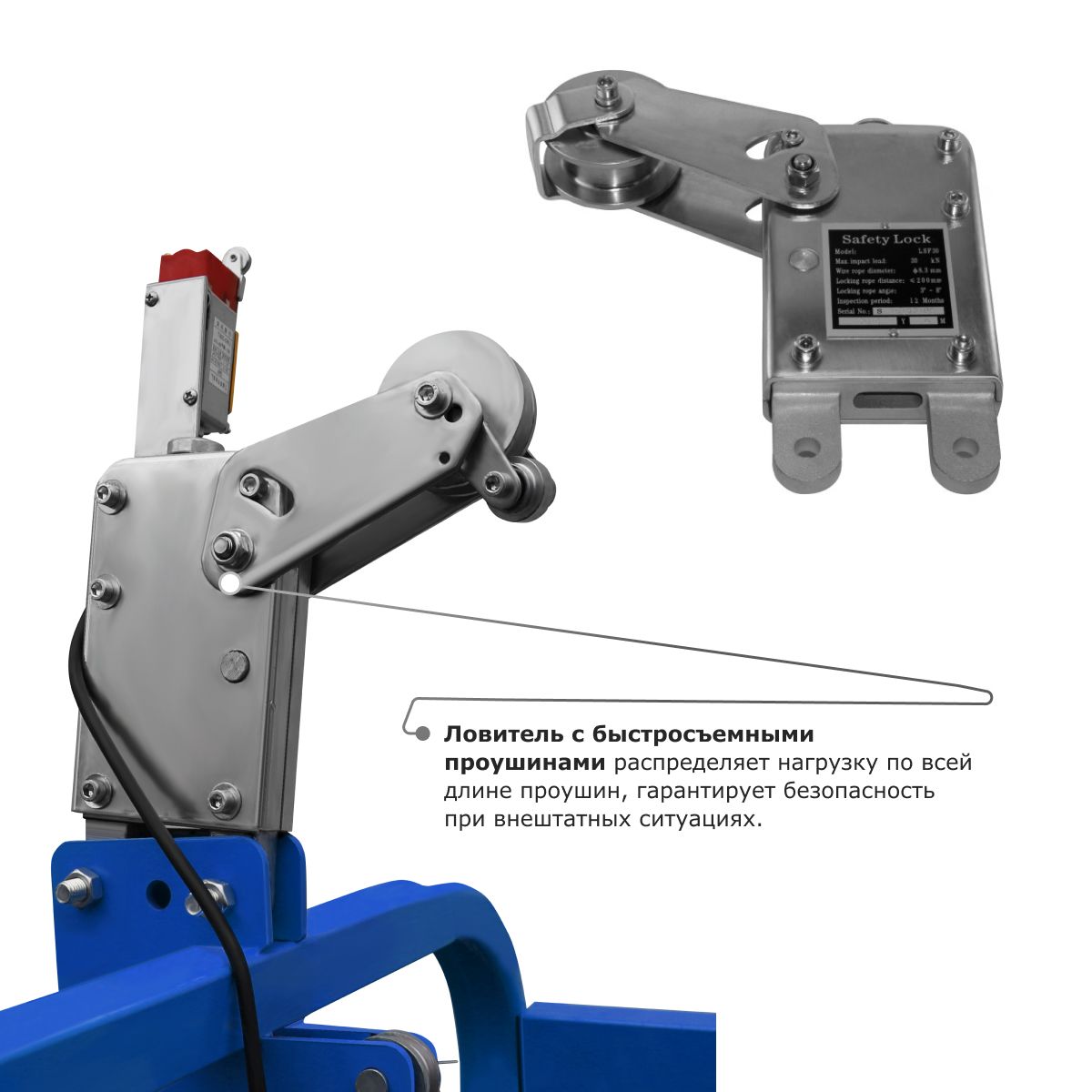 - Ловитель с быстросъемными проушинами распределяет нагрузку по всей длине проушин, гарантирует безопасность при внештатных ситуациях.