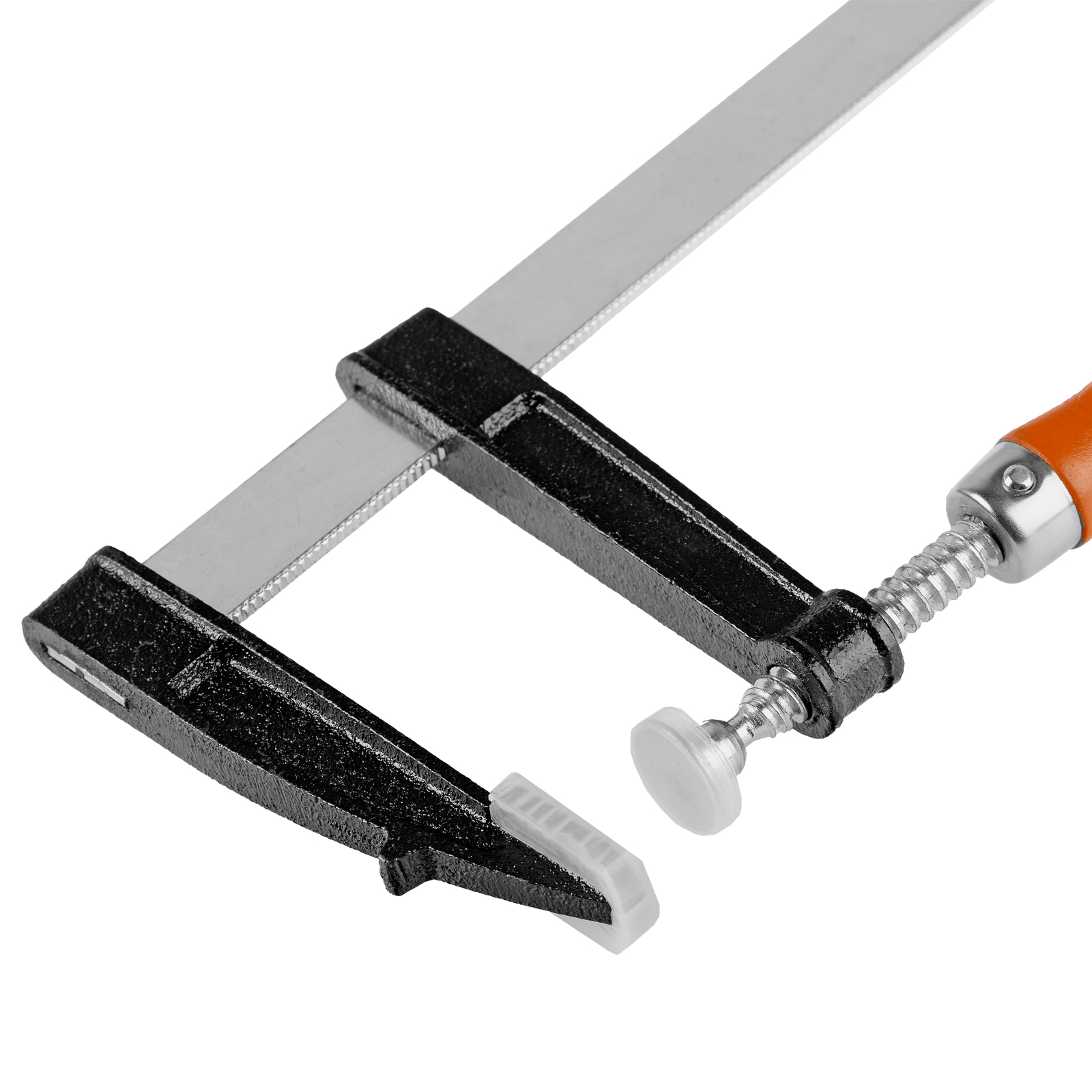 F-образная струбцина Sparta 204355 длиной 360 мм и величиной зажима 300 х 80 мм позволяет фиксировать заготовки из металла, древесины и других материалов для их соединения или обработки. Используется в столярном и слесарном деле. Деталь помещают между губками, одна из которых подвижна и служит для регулировки величины захвата. Винтовой зажим позволяет фиксировать заготовку со значительным усилием. Элементы конструкции выдерживают высокую температуру, поэтому струбцина подходит для проведения сварочных работ, при этом пластиковые накладки необходимо снять.