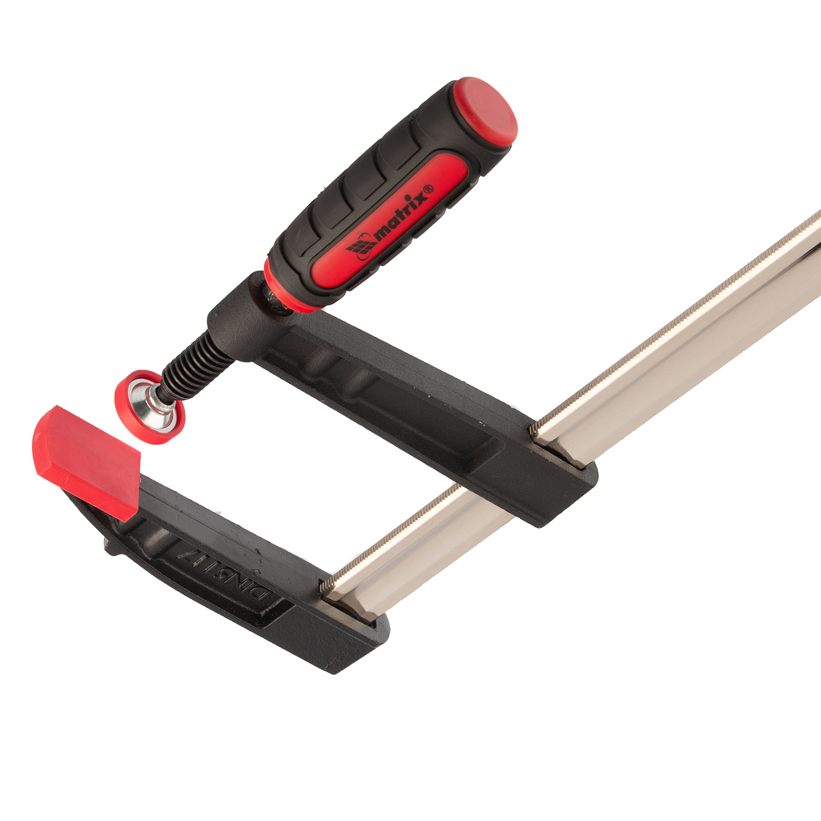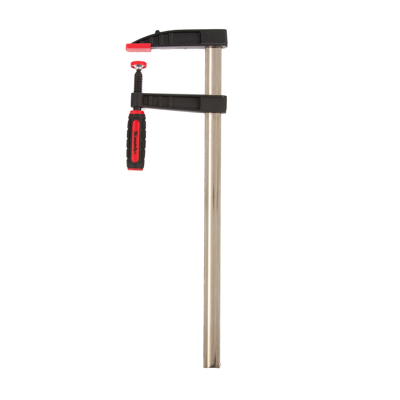 F-образная струбцина Matrix 20407 размером 500 х 120 х 600 мм используется для зажима металлических, деревянных и других заготовок для их последующей обработки или сборки. Представляет собой штангу, на которой установлено 2 кронштейна — неподвижный и подвижный. Деталь помещается между ними и прижимается к губкам при помощи винтового зажима с трапециевидной резьбой. Подвижный кронштейн позволяет регулировать величину захвата, которая может достигать 500 мм. Струбцину применяют для выполнения слесарных и столярных работ.