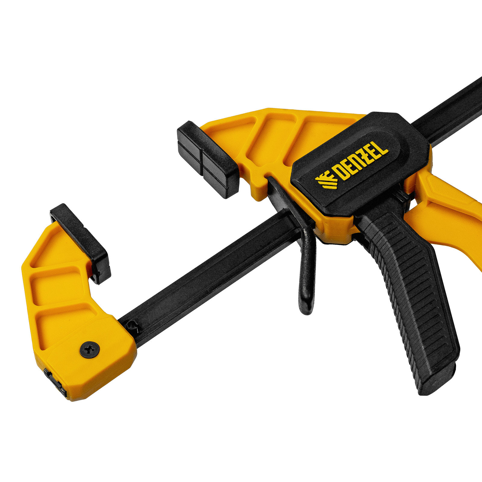 - Комфортное использование — струбцина весит всего 360 г, обрезиненная кнопка фиксации обеспечивает удобный захват.