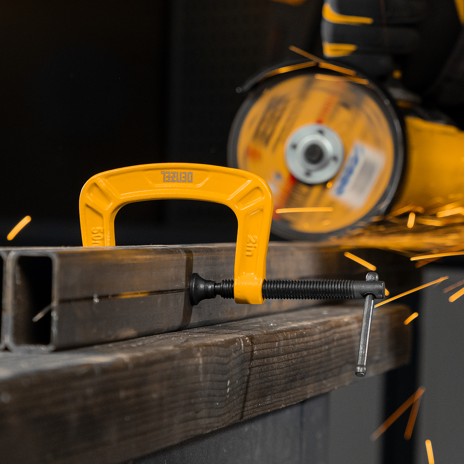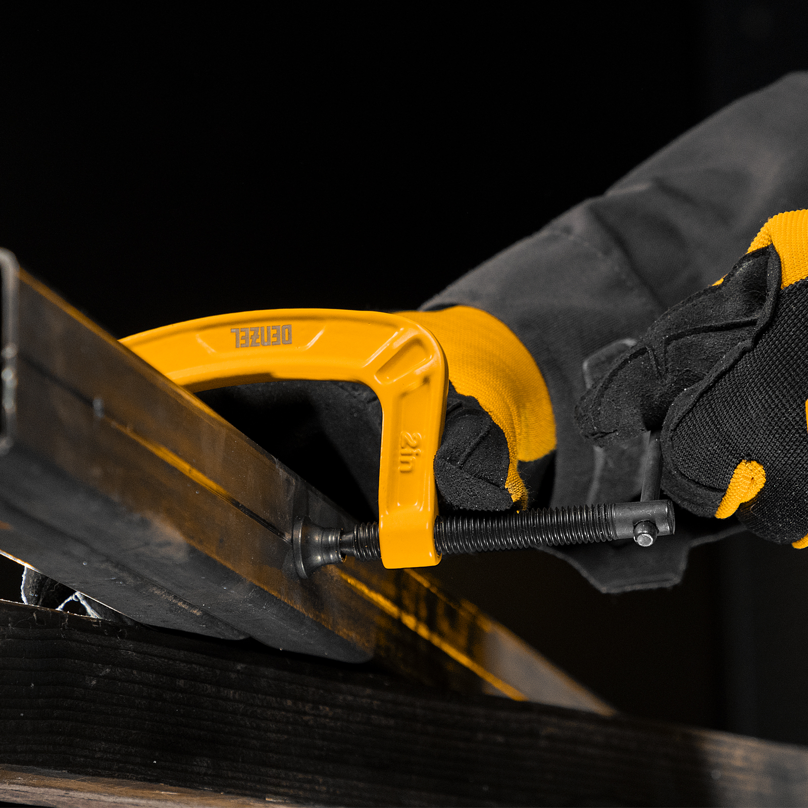 G-образная струбцина Denzel 20641 с максимальной шириной зажима 50 мм используется для фиксации заготовок или закрепления их на верстаке, станке или между собой. Позволяет склеивать детали, а также сверлить их, шлифовать, опиливать и проводить другие работы. Может использоваться во время выполнения сварочных работ. Винт с трапециевидной резьбой обеспечивает надежную фиксацию предметов. Струбцина применяется в слесарном и столярном деле, будет полезна также домашнем хозяйстве.