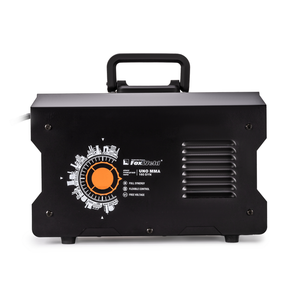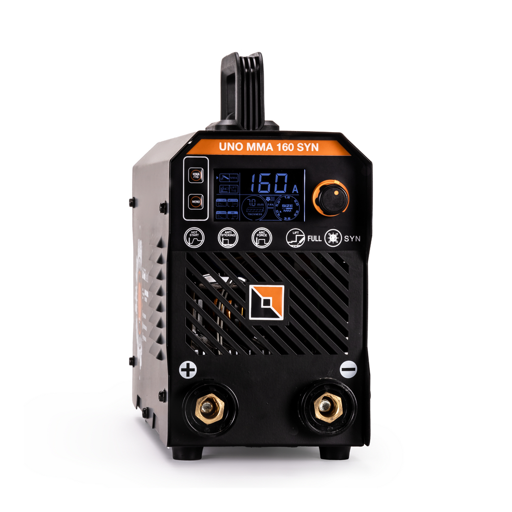 Сварочный аппарат UNO MMA 160 SYN c синергетическим управлением предназначен для ручной дуговой сварки (MMA) любыми типами электродов, а также для сварки вольфрамовыми электродами в среде инертного газа аргон (TIG LIFT). В модели есть полноценная синергетика, которая рекомендует соотношение параметра силы тока сварки к толщине свариваемого сплава металла. Для облегчения процесса сварки в режиме ММА и получения более качественного сварного соединения аппарат имеет регулируемые функции Нot Start (горячий старт) и Arc Force (форсаж дуги), а также AntiSticking (антиприваривание) с возможностью отключения. Функция VRD повышает безопасность и исключает риск поражения сварщика электрическим током. Процесс сварки становится более безопасным в замкнутых пространствах и при сварке в условиях повышенной влажности. Режим TIG LIFT позволяет проводить аргонодуговую сварку на постоянном токе изделий из черной и нержавеющей стали. Данный вид сварки характеризуется отсутствием брызг и более презентабельным внешним видом сварного шва. Для проведения аргонодуговой сварки необходимо дополнительно приобрести горелку с вентилем и баллон с газом аргон.РАСШИРЕННЫЙ СИНЕРГЕТИЧЕСКИЙ РЕЖИМ УПРАВЛЕНИЯ: Синергетическое управление дает возможность модифицировать все сварочные параметры, осуществляя регулировку лишь одного из них. Наличие синергетического режима управления позволяет легко и быстро настроить аппарат под любую задачу. Преимущества синергетики: простота в настройке даже неквалифицированным персоналом, быстрая установка сварочных параметров, гарантированное получение качественного сварного соединения. Синергетику можно отключить для работы в ручном режиме.РАБОТА БЕЗ ОСТАНОВКИ: Параметр ПВ 100% на максимальном токе при КПД 85% обеспечивает бесперебойную устойчивую работу сварочного аппарата в течении всего рабочего дня. Это позволяет производить безостановочный сварочный процесс и выполнять работы, которые требуют больших временных затрат, что повышает скорость и производительность.РАБОТА ПРИ ПОНИЖЕННОМ НАПРЯЖЕНИИ: Аппарат работает от однофазной сети 220 В при перепадах напряжения от 140 до 270 В. Это даёт возможность производить сварочные работы в «плохих» сетях – на даче, в домашних условиях при пониженном или нестабильном напряжении.ИНФОРМАТИВНАЯ ПАНЕЛЬ УПРАВЛЕНИЯ: На лицевой панели рядом с клавишами управления расположен информативный цифровой экран, на котором отражены процессы и параметры сварки, установленные значения настроек. Задать параметры сварки можно при помощи двух кнопок и шаговой ручки регулировки. С помощью одной кнопки выбирается режим сварки: ручная дуговая покрытым электродом (MMA) или сварка неплавящемся вольфрамовым электродом (TIG LIFT). Вторая кнопка позволяет переключать параметры сварки, а при помощи плавного вращения ручки выставляются числовые значения.НЕБОЛЬШОЙ ВЕС: Небольшой вес и размеры сварочного аппарата плюс ручка на корпусе и ремень для переноски добавляют мобильности, компактности и идеально подходят для бытового и полупрофессионального использования.ПРЕИМУЩЕСТВА:Процесс поджига дуги сварки в среде Аргона вольфрамовым электродом происходит за счёт касанияПри условии работы от сети с некачественным электроснабжением, аппарат может хорошо работать с сетевым напряжением от 140 до 270 вольт, процесс сварки п