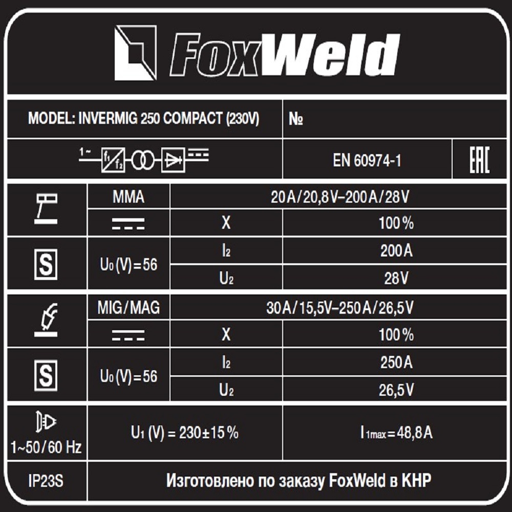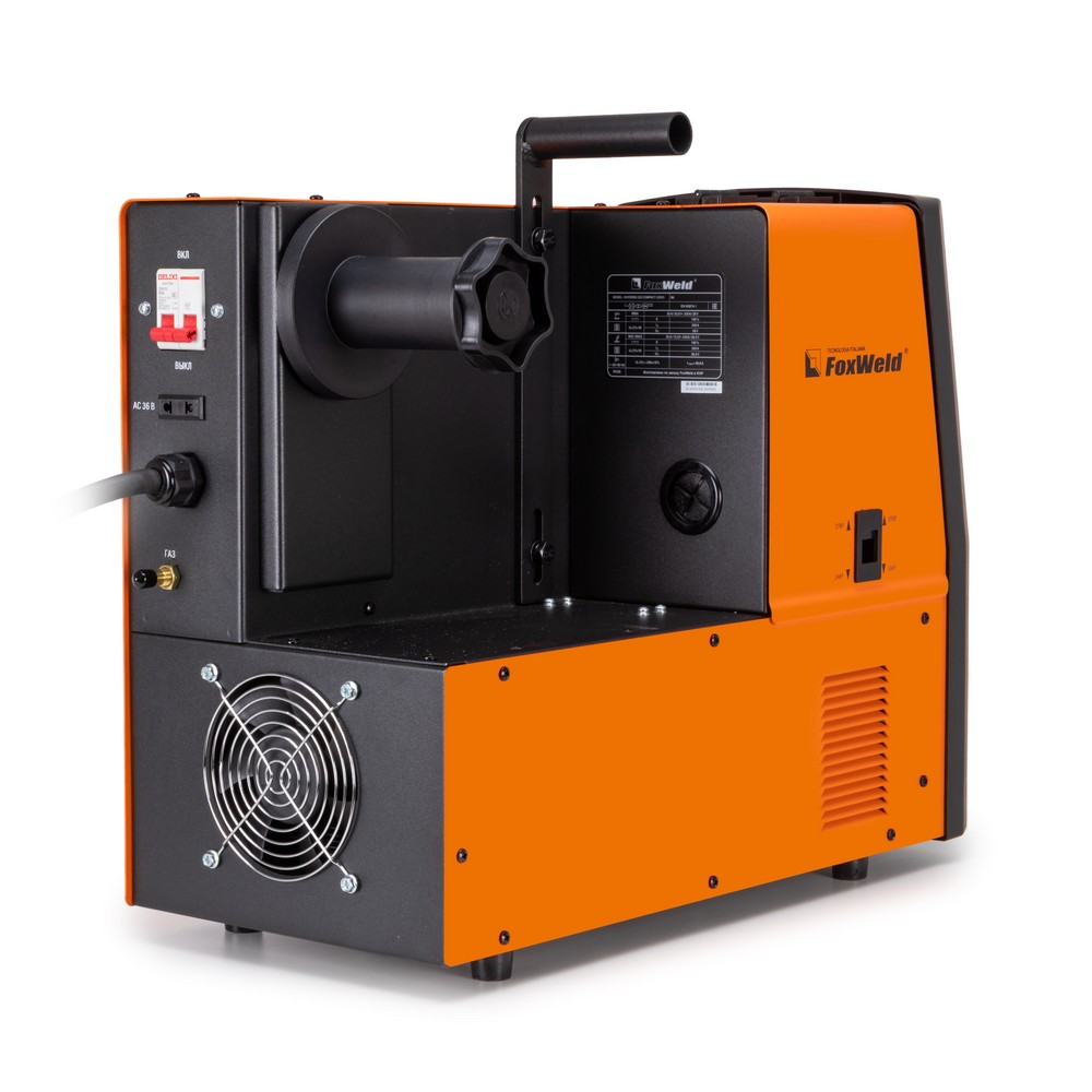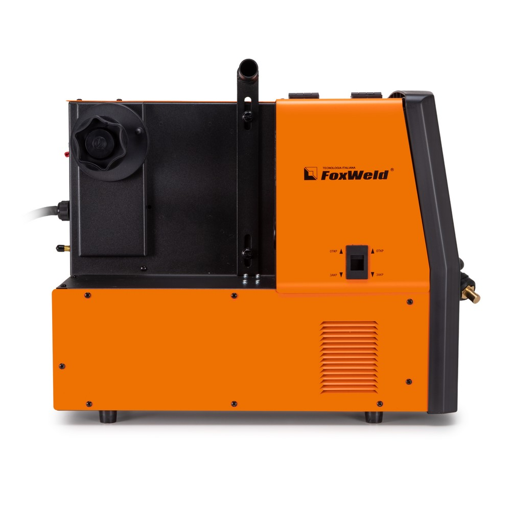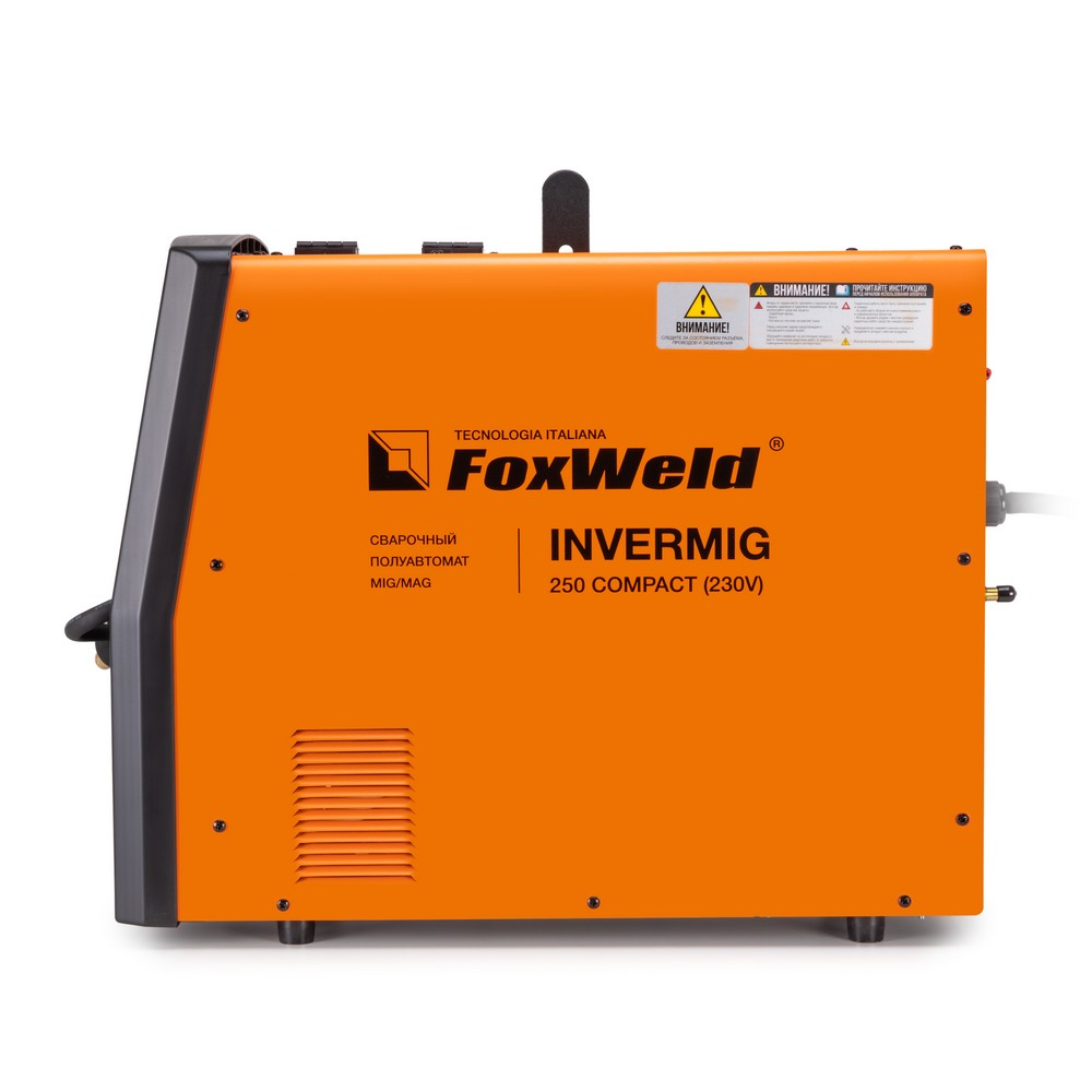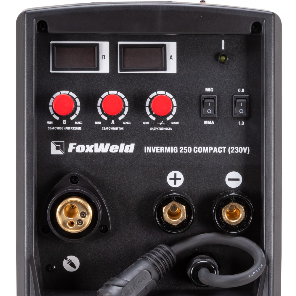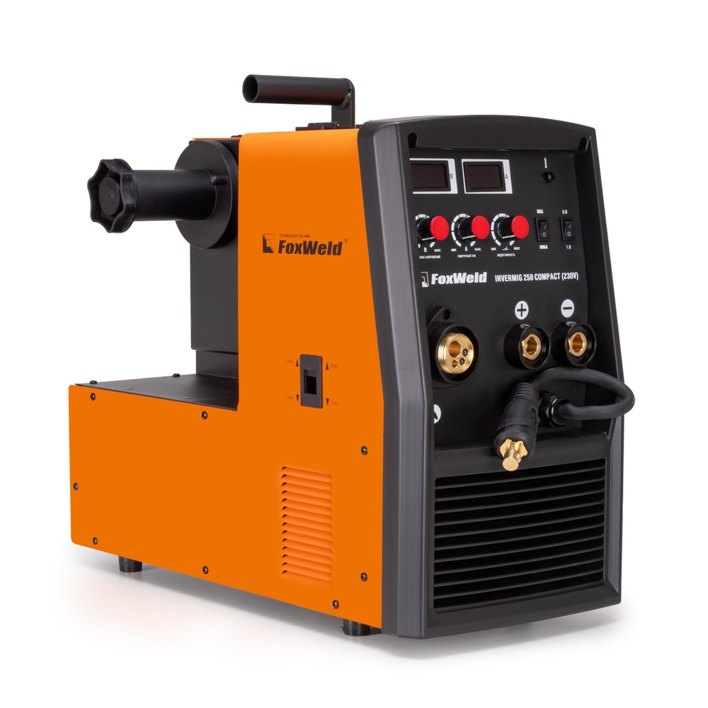 Сварочный полуавтомат Foxweld Invermig 250 Compact (230V) позволяет производить сварку постоянным током, используя инверторную технологию преобразования и управления сварочным током. При этом сварочный полуавтомат обеспечивает идеальные параметры сварки, даже при большом падении входящего напряжения, особенно на малых токах, при сварке небольших толщин. Invermig 250 Compact (230V) позволяет проводить следующие виды работ: полуавтоматическую сварку сплошной проволокой в среде защитного газа MIG/MAG и порошковой проволокой без использования защитного газа, а также ручную дуговую сварку MMA на постоянном токе штучными электродами. Регулировка индуктивности в режиме полуавтоматической сварки даёт возможность вести процесс сварки с минимальным разбрызгиванием металла и приспосабливать процесс к любому типу работ. Invermig 250 Compact (230V) — это идеальный аппарат для проведения авторемонтных и монтажных работ, а также в отраслях по производству различных стальных конструкций.РАБОТА БЕЗ ОСТАНОВКИ: Параметр ПВ 100% на максимальном токе при КПД 85% обеспечивает бесперебойную устойчивую работу сварочного аппарата в течении всего рабочего дня. Это позволяет производить безостановочный сварочный процесс и выполнять работы, которые требуют больших временных затрат, что повышает скорость и производительность.СВАРКА БЕЗ ЗАЩИТНОГО ГАЗА: Сварочный аппарат позволяет использовать самозащитную сварочную проволоку при полуавтоматической сварке. Самозащитная порошковая проволока даёт возможность проводить сварочные работы без газа, что упрощает процесс сварки даже для неопытного пользователя. Нет необходимости в применении защитного газа, тяжёлых и громоздких газовых баллонов.РАБОТА ПРИ ПОНИЖЕННОМ НАПРЯЖЕНИИ: Аппарат работает от однофазной сети 220 В при перепадах напряжения от 160 до 240 В. Это даёт возможность производить сварочные работы в «плохих» сетях – на даче, в домашних условиях при пониженном или нестабильном напряжении.РЕГУЛИРОВКА ИНДУКТИВНОСТИ: С помощью ручной настройки индуктивности можно дополнительно регулировать сварочную дугу для формирования нужного сварного шва. Регулировка индуктивности позволяет вести процесс сварки с минимальным разбрызгиванием металла и приспосабливать процесс к любому типу работ.ПРЕИМУЩЕСТВА:Сварка без защитного газа порошковой проволокойРабота при пониженном напряжении от 160 ВВ верхней части передней панели аппарата расположены органы индикации и управленияДва цифровых дисплея для отображения параметров сварочного тока и напряженияСветодиод сигнализирует, если сработает термозащита при перегревеДва тумблера: один выставляет режим сварки, второй регулирует скорость подачи проволоки в зависимости от её диаметраКнопка подачи (заправки) проволоки в отсеке для катушек без траты защитного газаРучки плавной регулировки отвечают за параметры индуктивности, тока и напряжения сваркиМощный и эффективный вентилятор активно охлаждает воздушным потоком нагревающиеся элементы источника питания, находящиеся внутри корпусаСварочное устройство имеет класс защиты не IP21S, как у большинства моделей, а IP23SФУНКЦИОНАЛЬНЫЕ ОСОБЕННОСТИ:РЕЖИМ MIG/MAG: Диаметр сварочной проволоки: 0,8 / 1,0 / 1,2 мм;Диапазон регулировки сварочного тока 30 - 250 А;Возможность сварки без газа самозащитной проволокой;Регулировка индуктивностиРЕЖИМ MMA: Ра