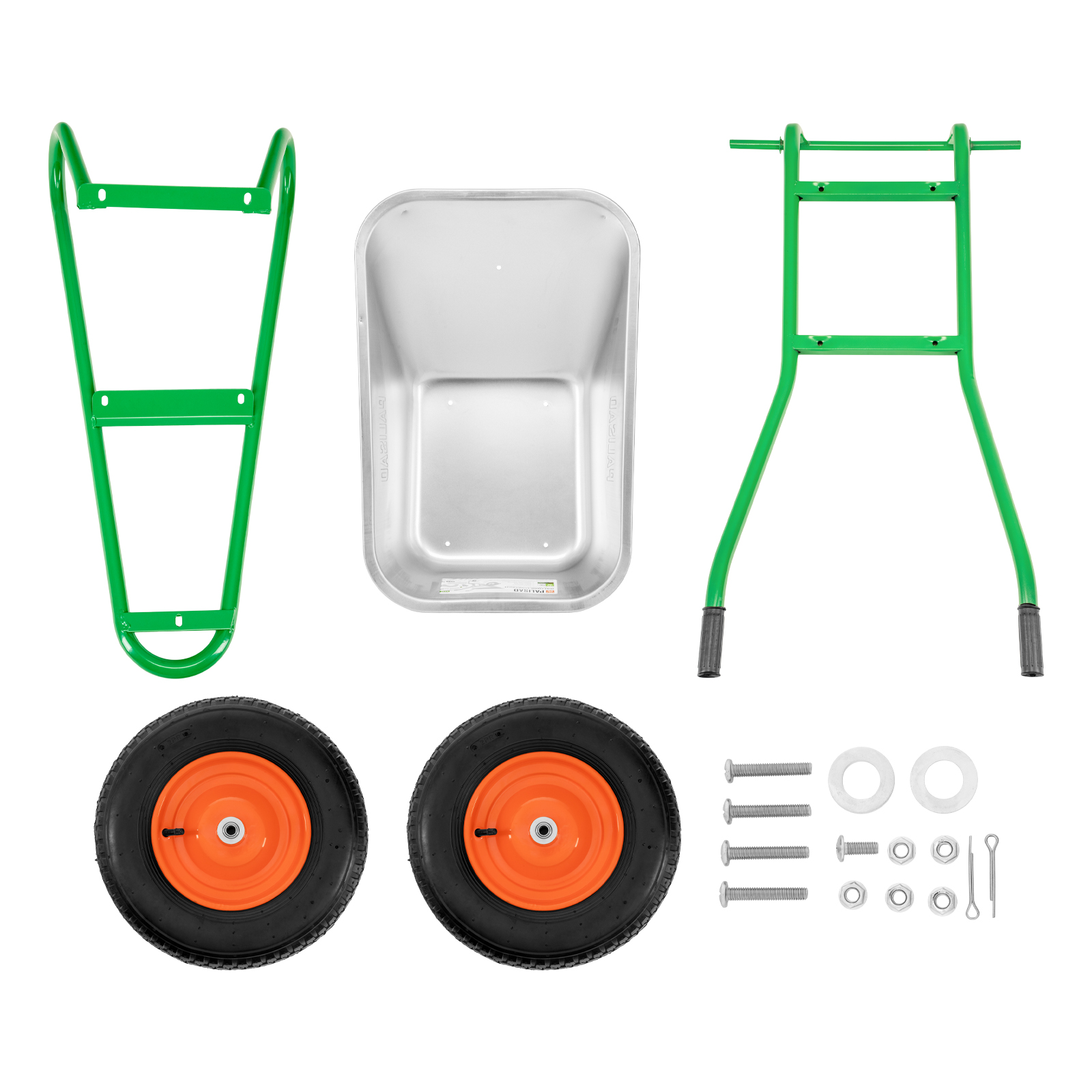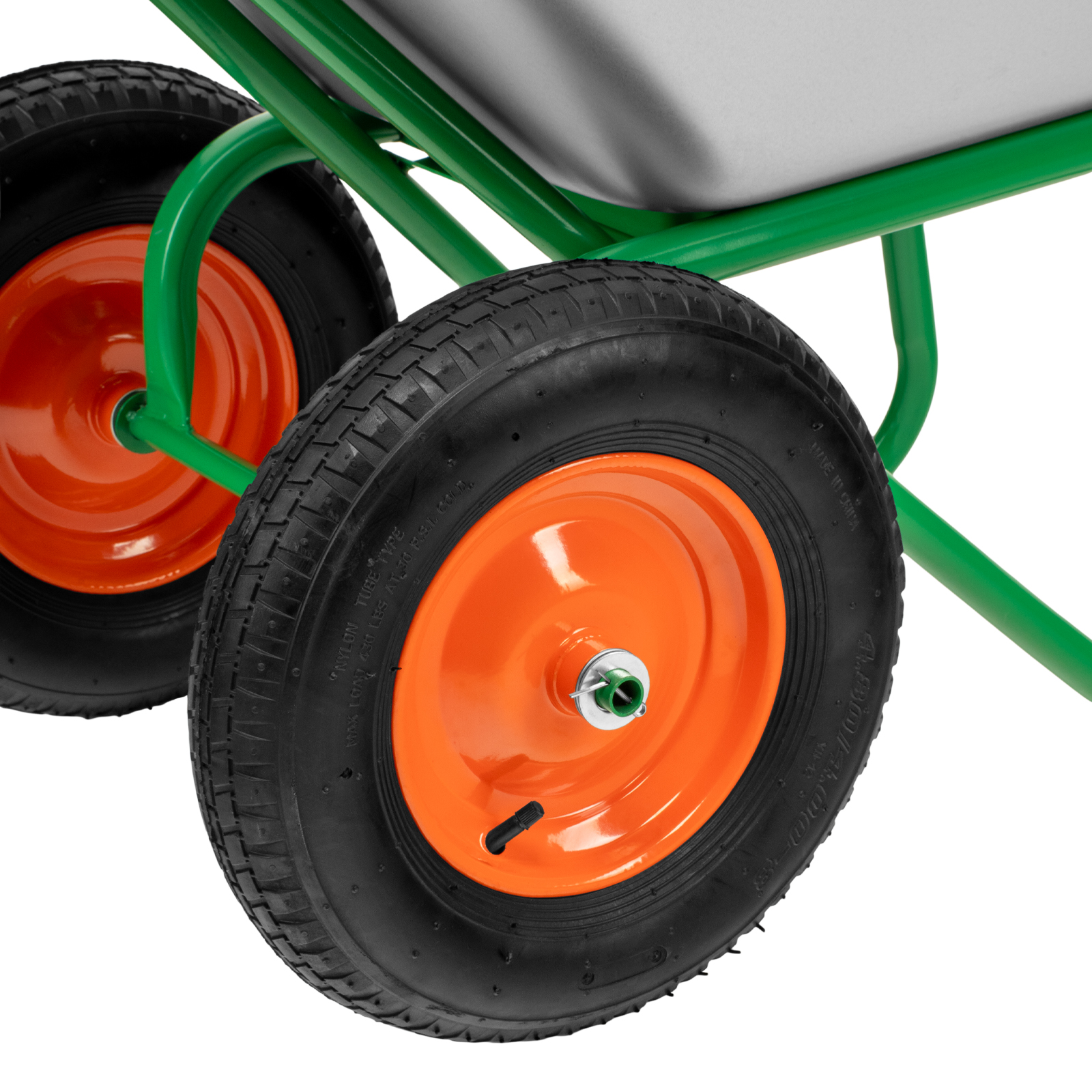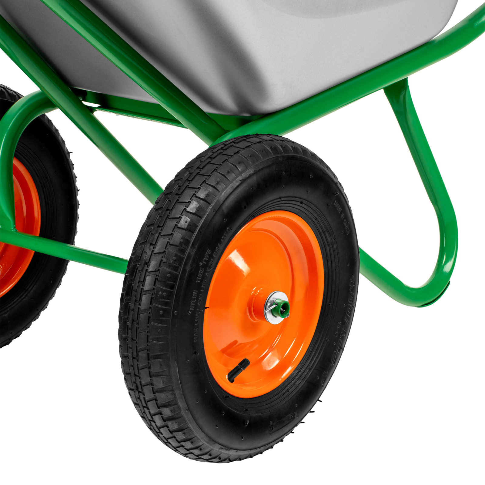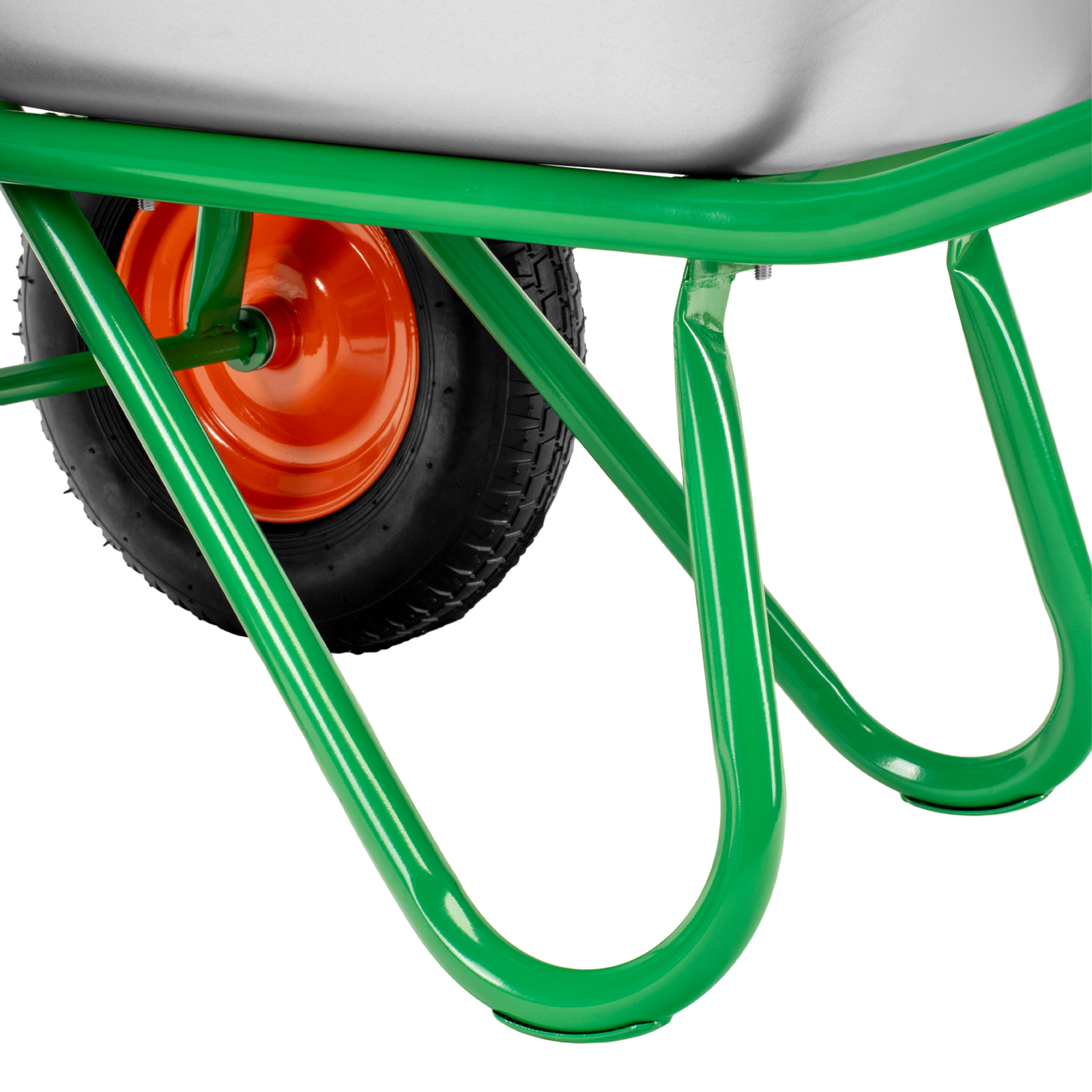 - Надежная конструкция — толщина стенок кузова составляет 0,7 мм, рамы — 1,2 мм, что обеспечивает увеличенную грузоподъемность тачки.