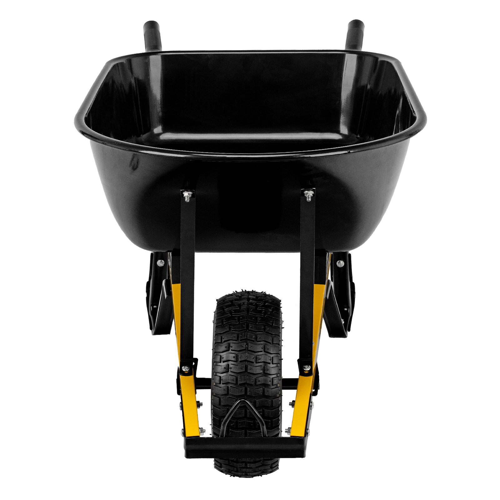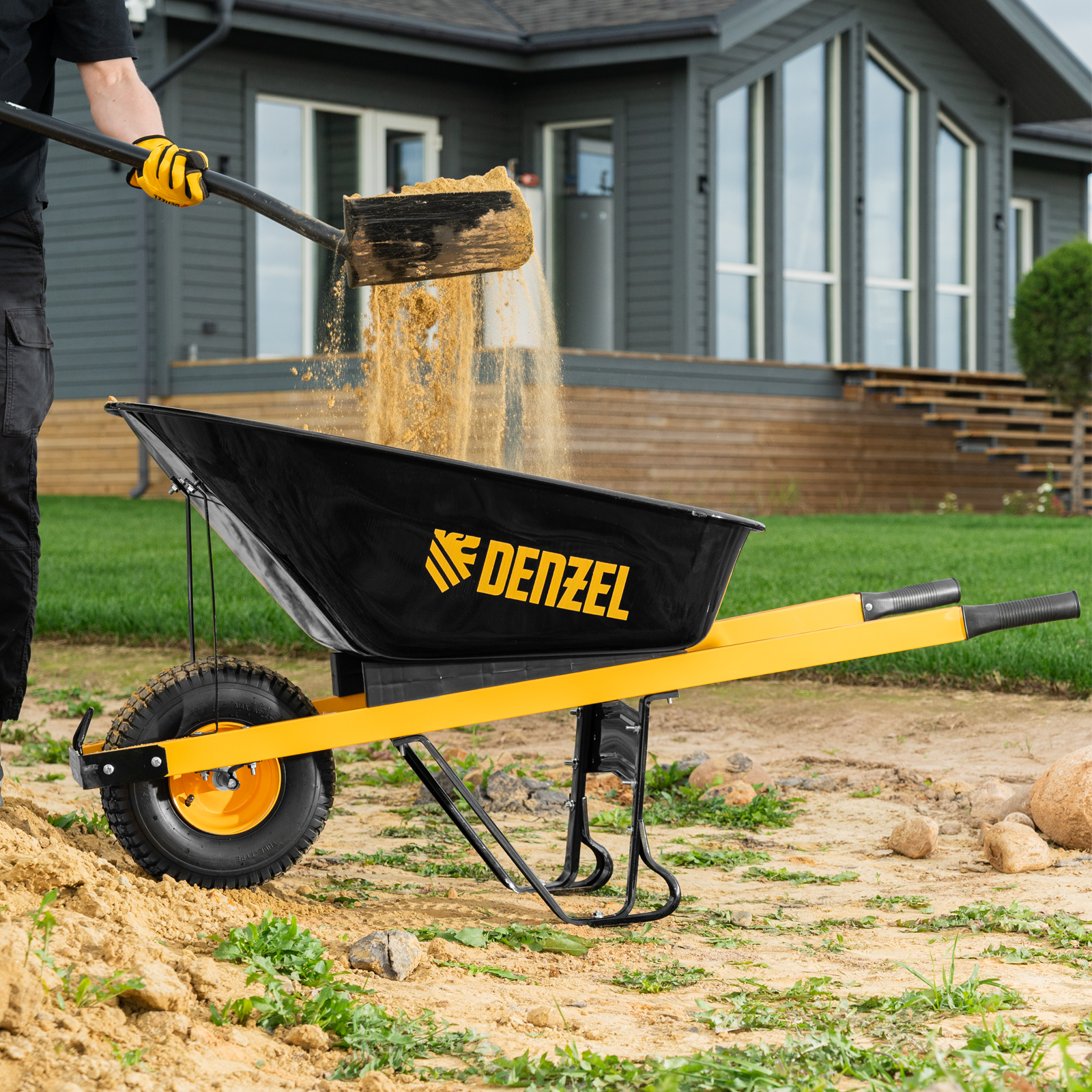 - Устойчивость — тачка не проваливается в грунт благодаря широкому пневмоколесу и подпятникам на ножках.