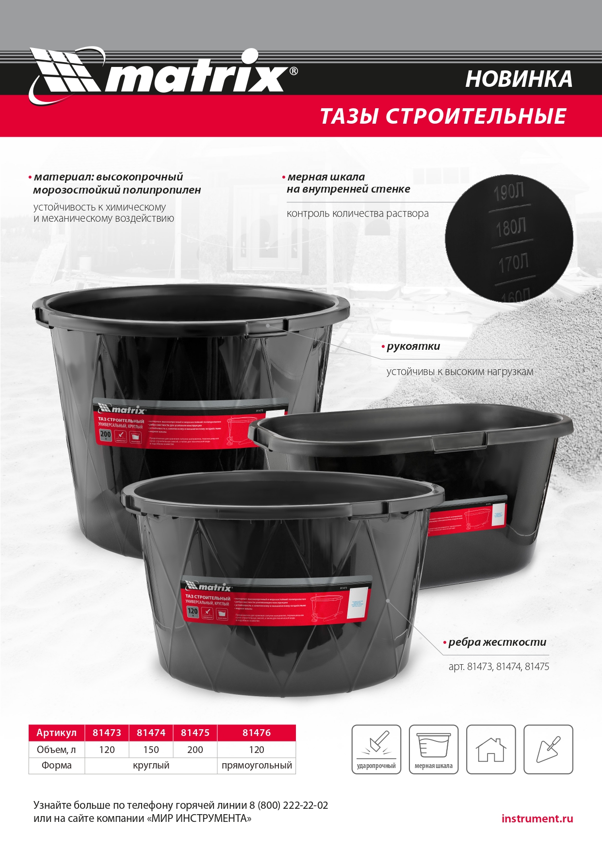 Таз строительный круглый универсальный, 200л, ударопрочный, с ребрами жесткости Matrix в Краснодаре