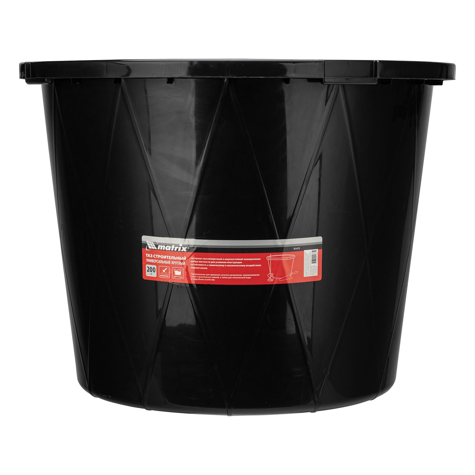 Круглый строительный ударопрочный таз Matrix 81475 с ребрами жесткости, объемом 200 л, универсален в применении: он используется для перемешивания строительных смесей, хранения сыпучих материалов и воды для технических нужд. Будет полезен во время проведения строительно-отделочных работ, пригодится также в подсобном хозяйстве и на огороде.