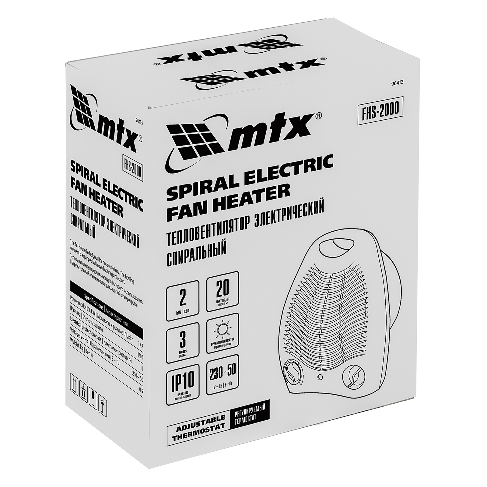 Электрический тепловентилятор MTX FHS-2000 96413 мощностью 1000/2000 Вт, с нагревателем спирального типа и вентилятором, имеет 3 режима работы и используется для обогрева комнат площадью до 20 кв. м в квартире или на даче. Его можно применять для поддержания необходимой температуры в помещении в холодную погоду, а также для вентиляции в жару. Устройство устанавливают на полу или на столе, управление осуществляется при помощи 2 механических переключателей.