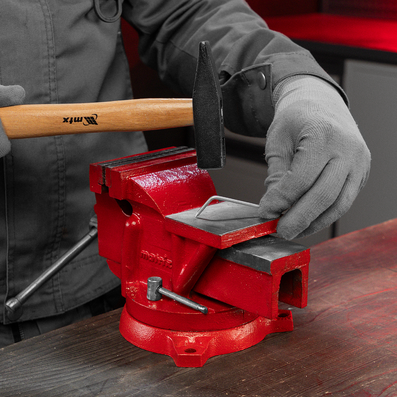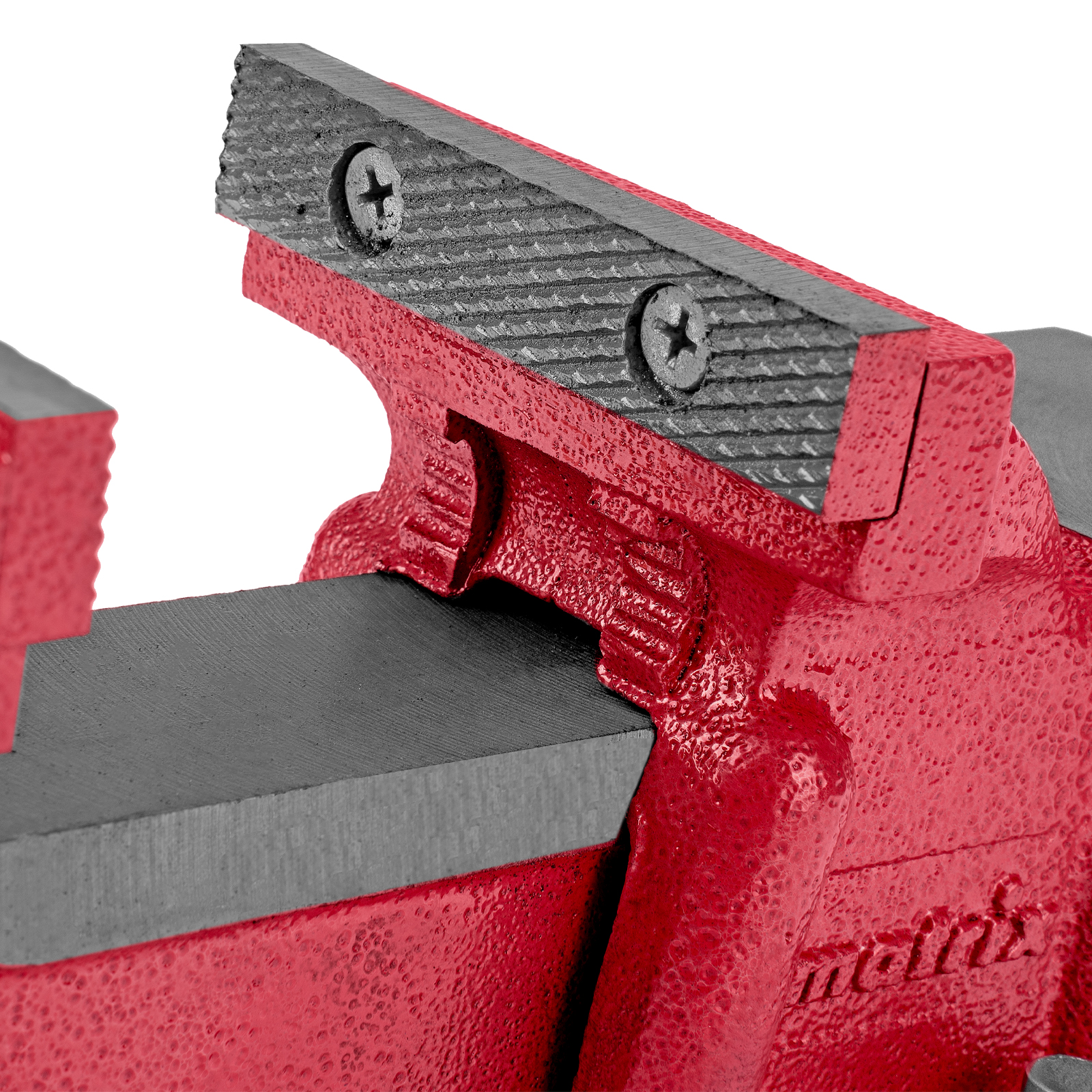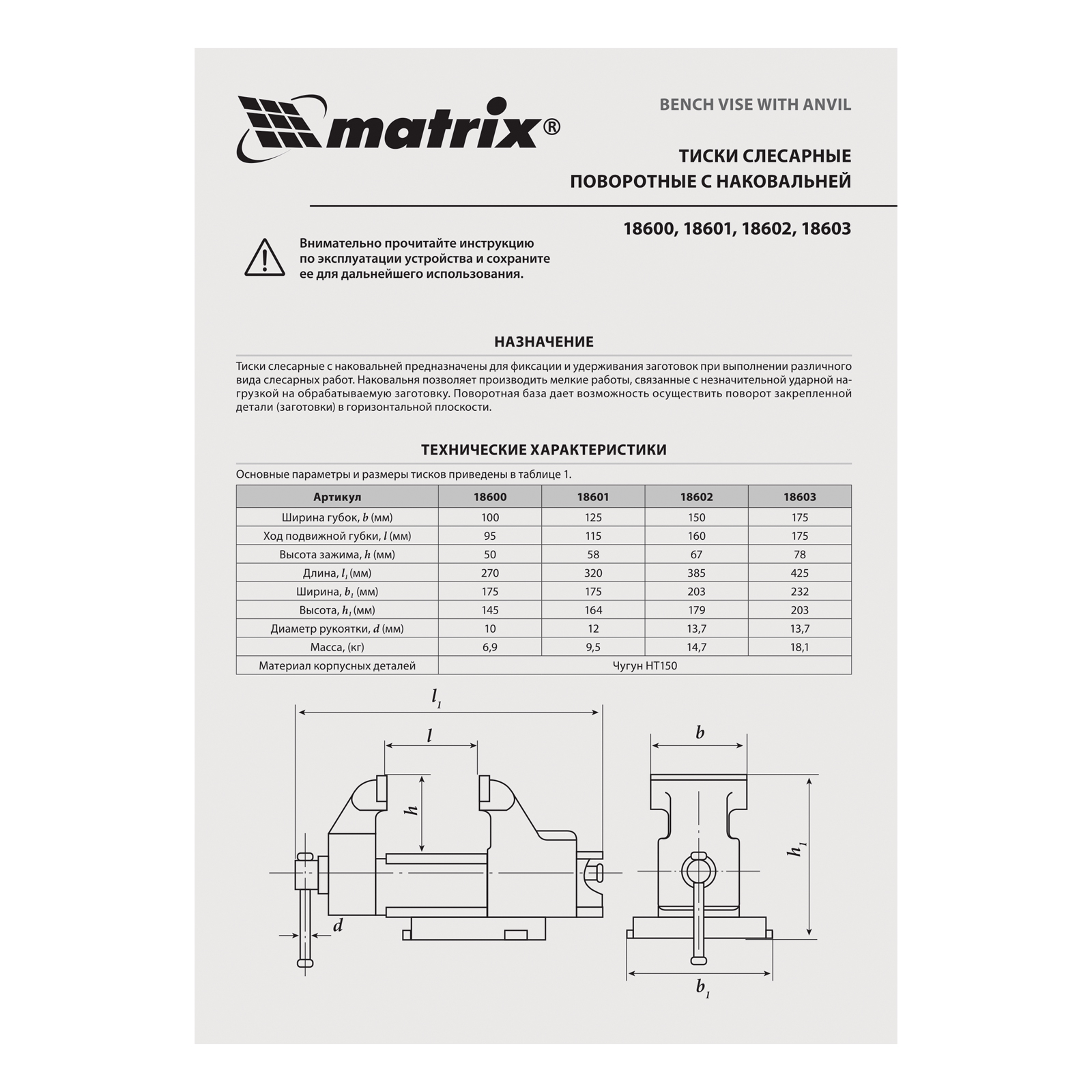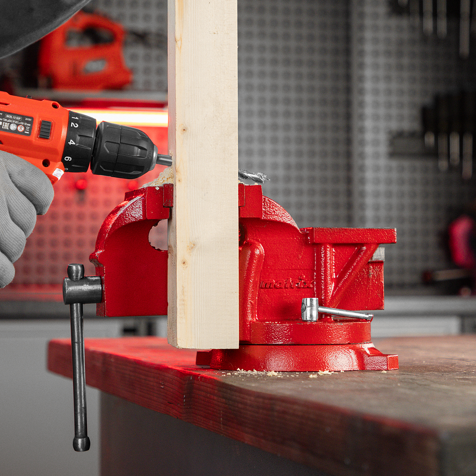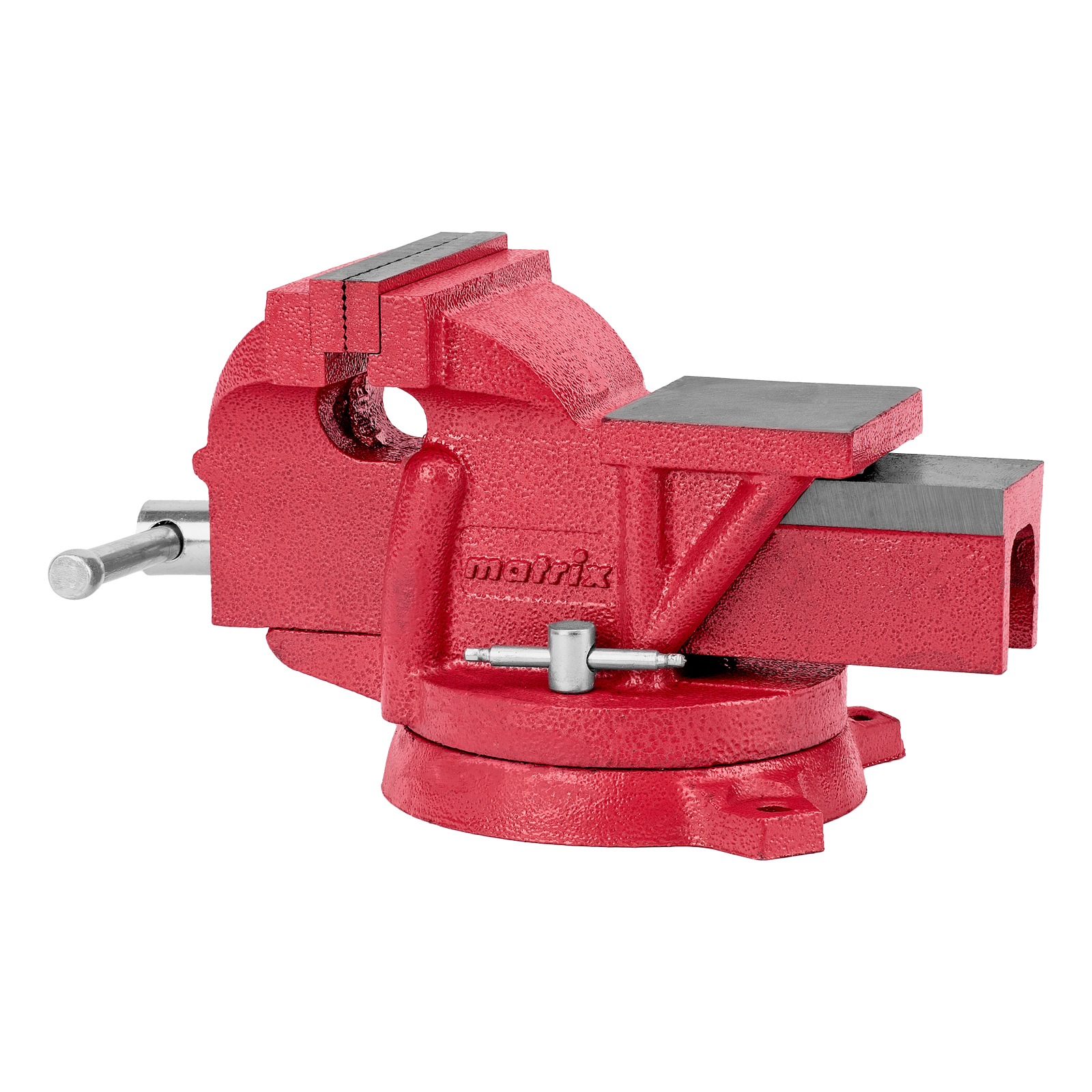 Поворотные слесарные тиски Matrix 18600 с наковальней и губками шириной 100 мм имеют рабочий ход 95 мм и предназначены для захвата и фиксации различных деталей. Поворотный механизм с прижимными винтами позволяет вращать тиски на 360° и фиксировать их в выбранном положении для удобной обработки заготовок с разных сторон. Инструмент используется для шлифовки, сверления и проведения других работ. Будет полезен в мастерской и гараже.