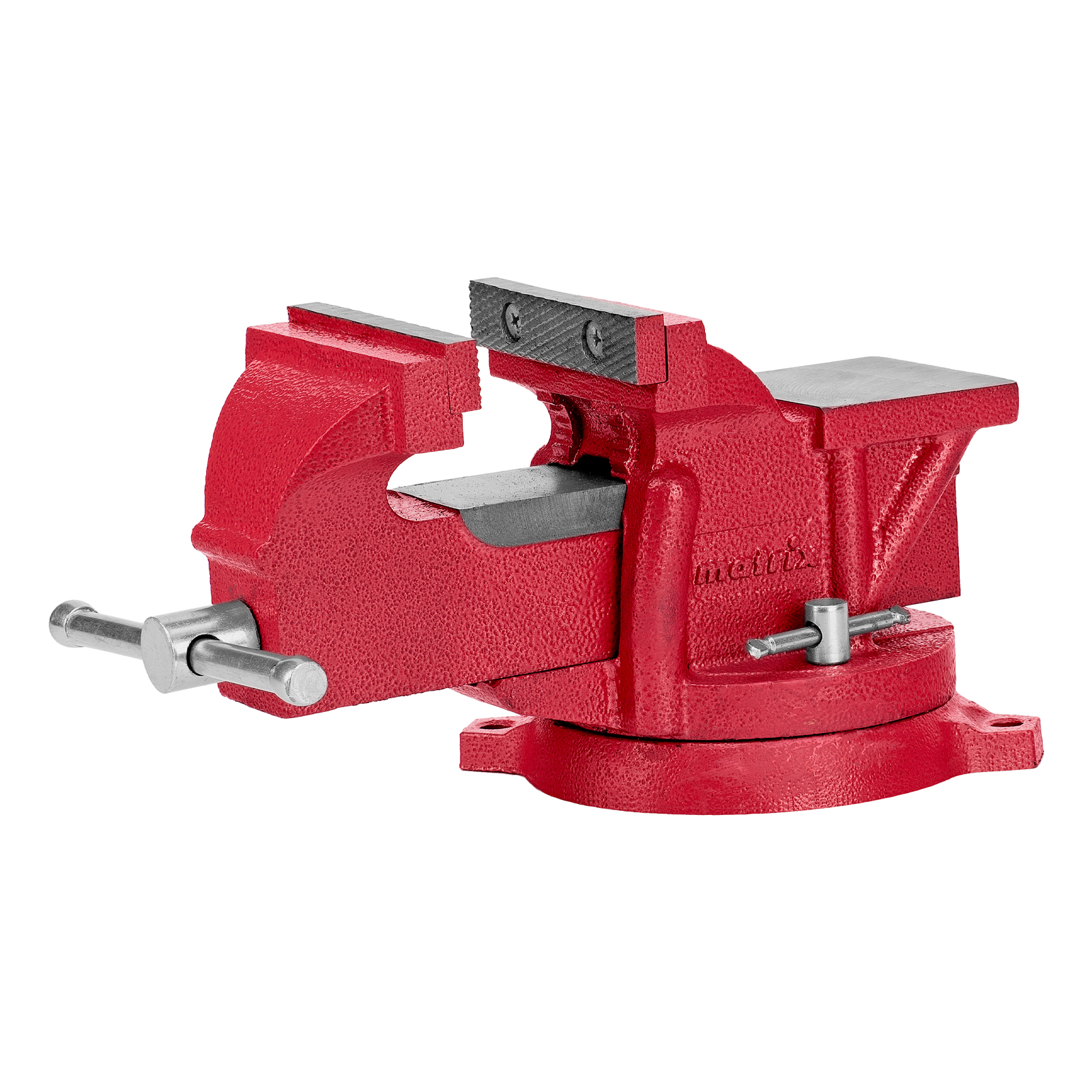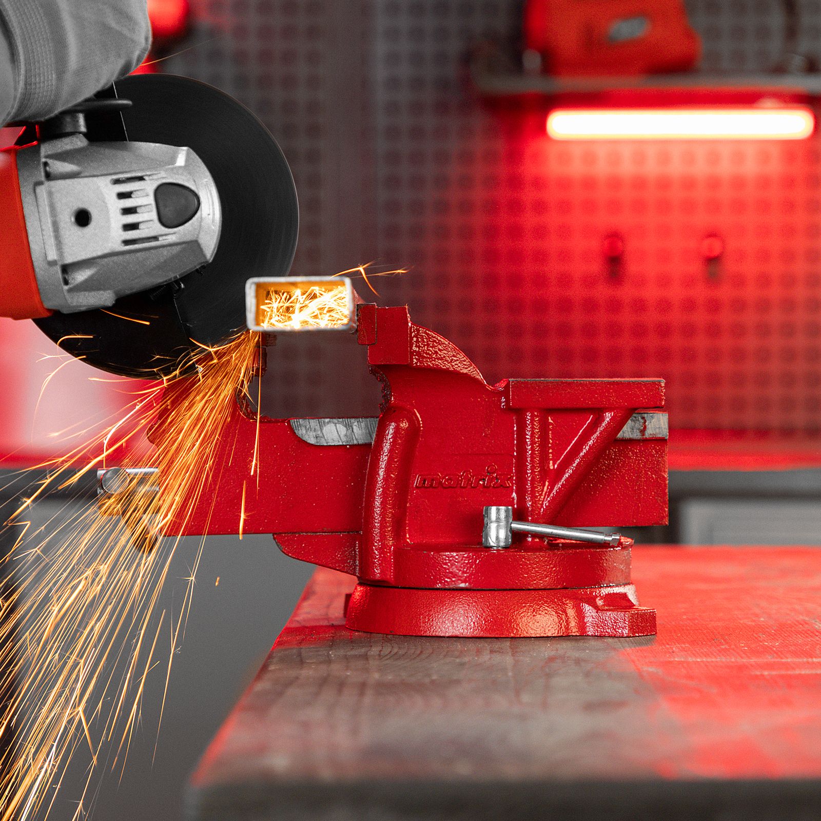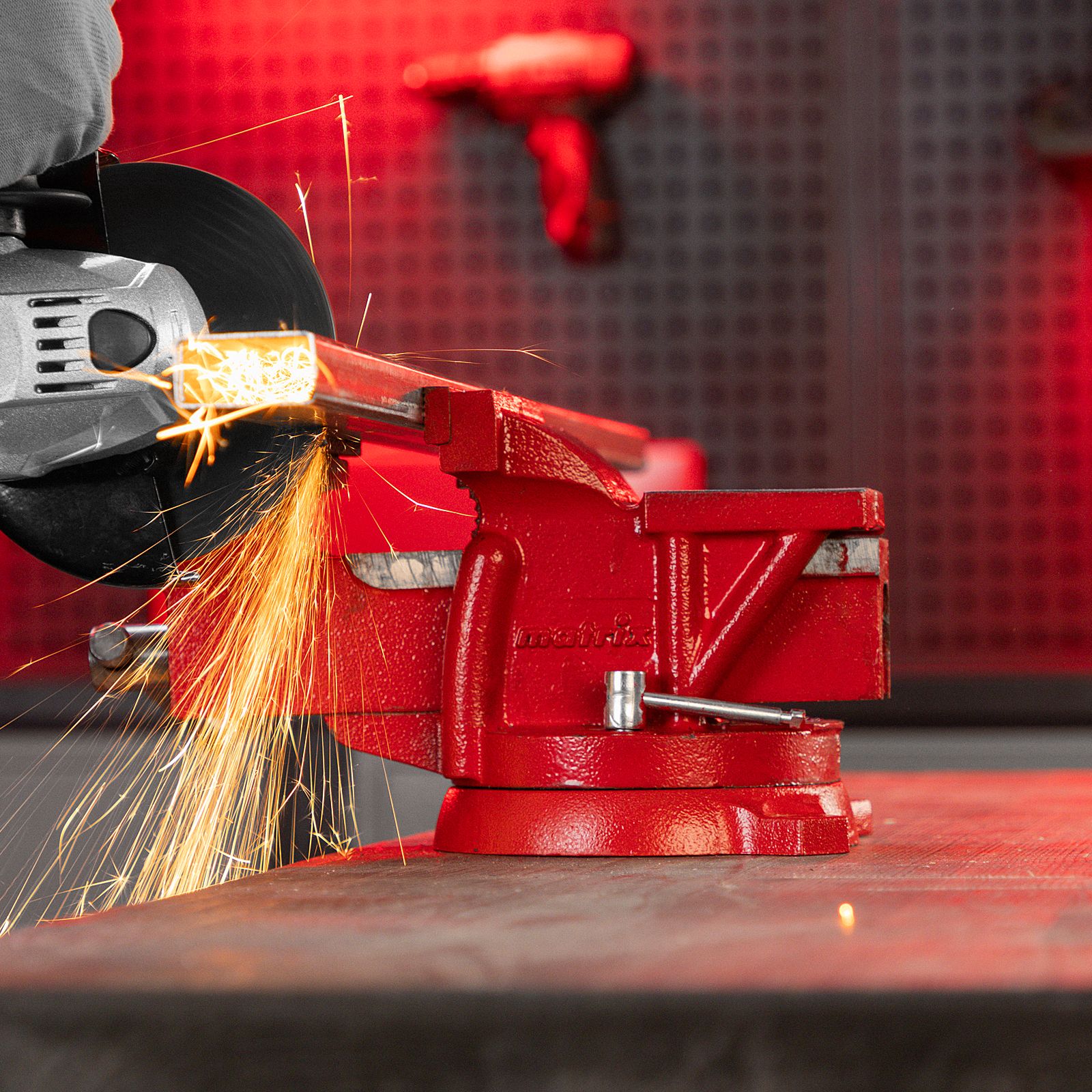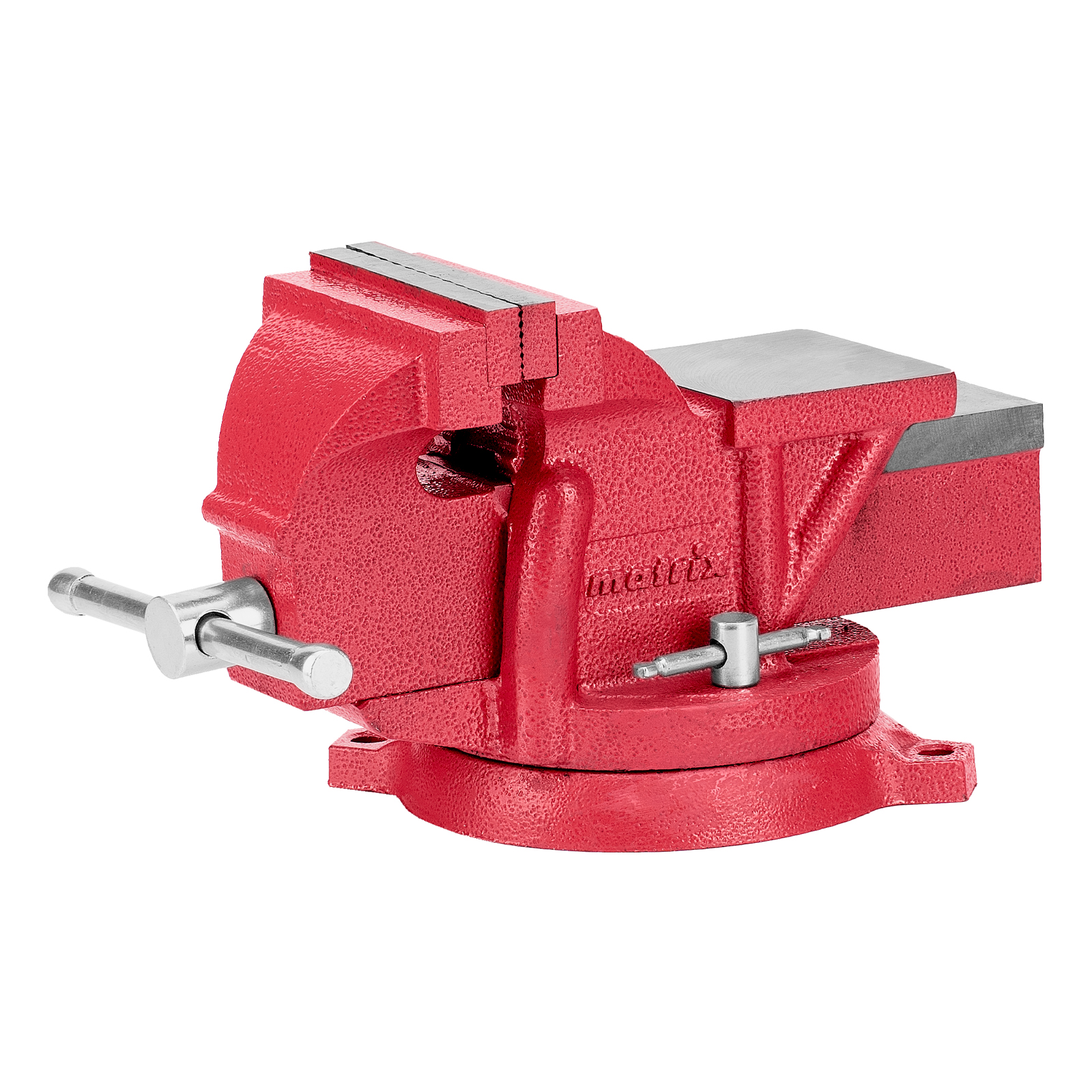Поворотные слесарные тиски Matrix 18600 с наковальней и губками шириной 100 мм имеют рабочий ход 95 мм и предназначены для захвата и фиксации различных деталей. Поворотный механизм с прижимными винтами позволяет вращать тиски на 360° и фиксировать их в выбранном положении для удобной обработки заготовок с разных сторон. Инструмент используется для шлифовки, сверления и проведения других работ. Будет полезен в мастерской и гараже.