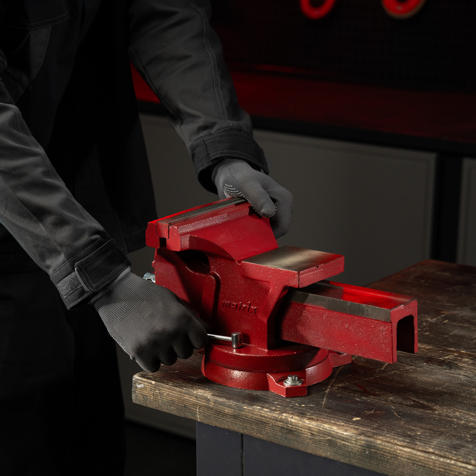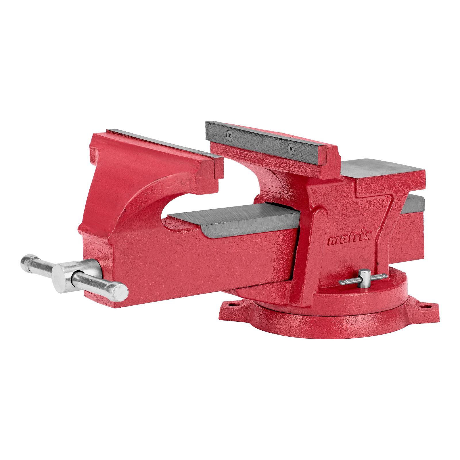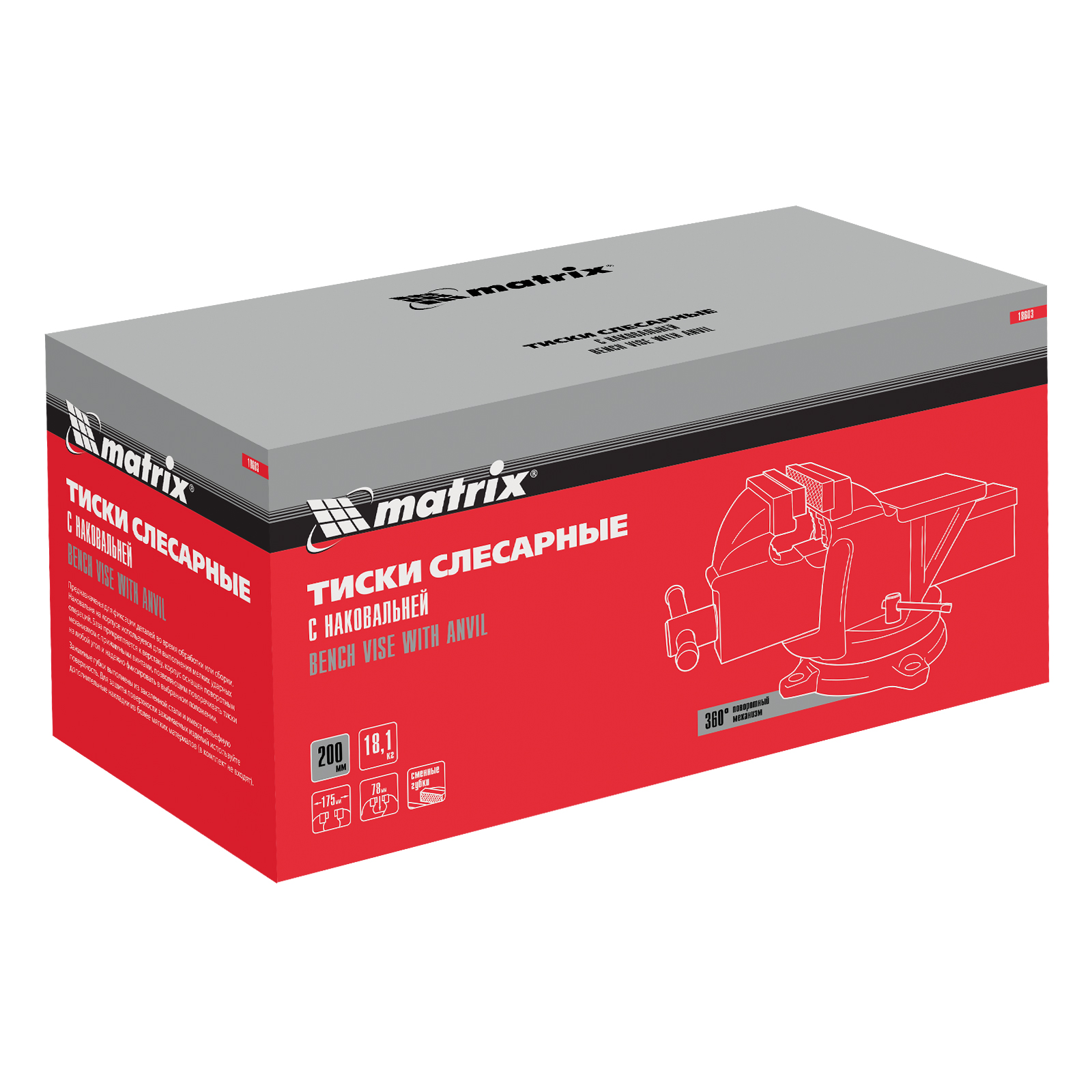 Поворотные слесарные тиски Matrix 18603 с наковальней и губками шириной 200 мм имеют рабочий ход 175 мм и предназначены для захвата и фиксации различных деталей. Поворотный механизм с прижимными винтами позволяет вращать тиски на 360° и фиксировать их в выбранном положении для удобной обработки заготовок с разных сторон. Инструмент используется для шлифовки, сверления и проведения других работ. Будет полезен в мастерской и гараже.