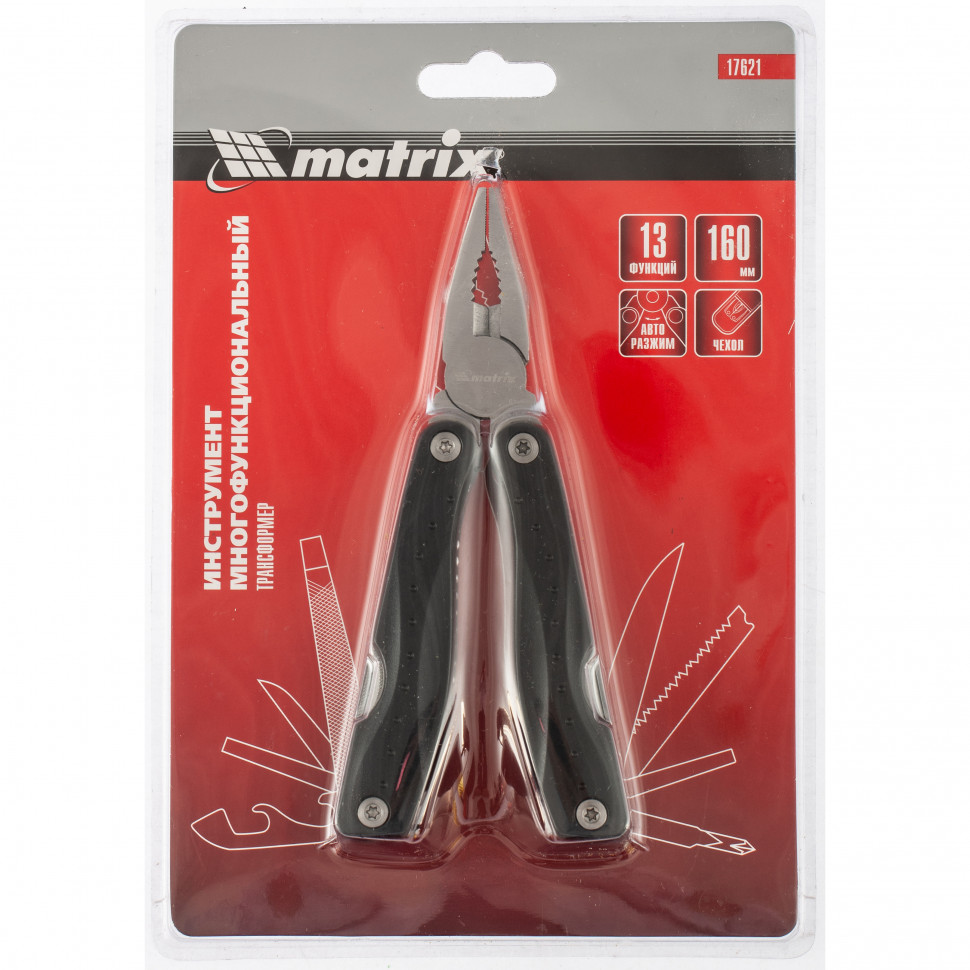 Трансформер Matrix 17621 длиной 160 мм имеет 13 функций и авторазжим, поставляется с чехлом. Его можно использовать в гараже — мультитул включает в себя длинногубцы с кусачками и захватом полукруглых предметов, а также отвертки. Инструмент пригодится в походе, на рыбалке или охоте, поскольку имеет в составе нож, пилу, открывалку и консервный нож. Благодаря пилке для ногтей трансформер будет полезен и в быту.