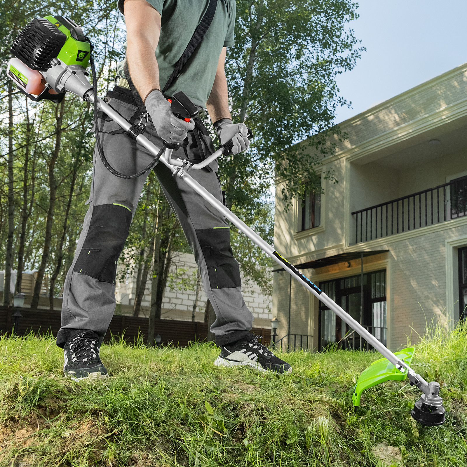 - Полуавтоматическая подача лески — достаточно слегка ударить кнопкой катушки о землю, не останавливая двигатель.