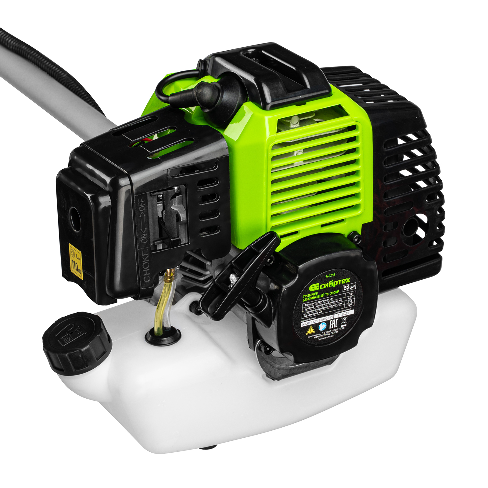 Триммер бензиновый Сибртех ТС-3000Р 962265 с двигателем объемом 52 см3 и разъемной штангой поставляется комплектом, состоящим из 2 частей. Используется для стрижки газонной травы и скашивания растительности. Входящий в комплект поставки трехлопастный нож позволяет легко справляться с густой, жесткой травой и толстыми стеблями сорняков. Оснастка вращается с частотой 9500 об/мин, ширина скашивания леской составляет 420 мм, ножом — 255 мм. Двигатель мощностью 3 л.с. обеспечивает высокую производительность инструмента и позволяет быстро справиться с работой.
