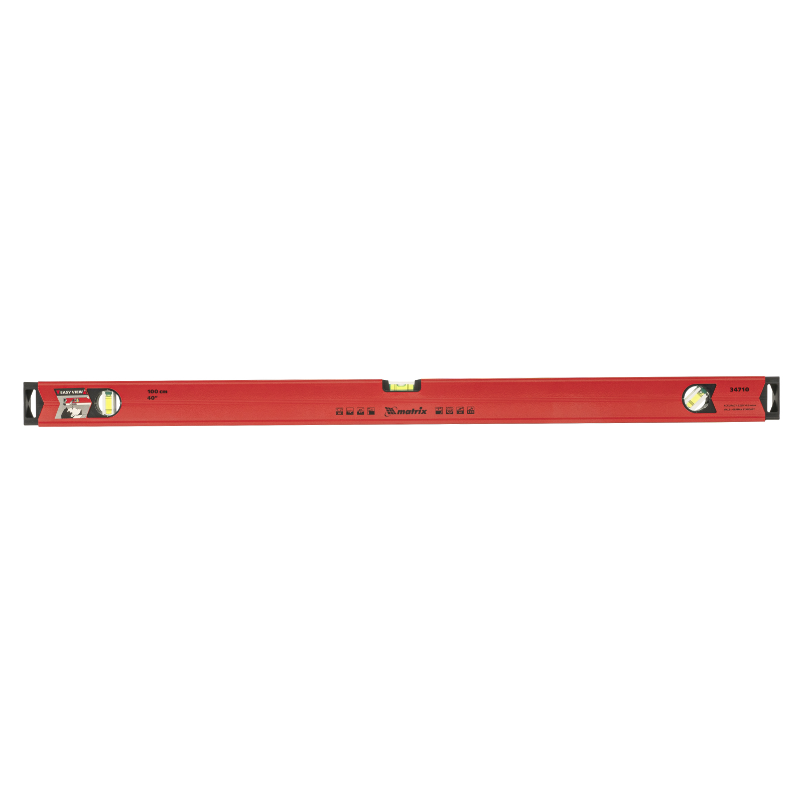 Уровень алюминиевый магнитный Matrix 34710 усиленной конструкции, длиной 1000 мм, с фрезерованной рабочей поверхностью, оснащен 3 глазками и одним зеркальным отражателем. Позволяет выявить отклонения от вертикали, горизонтали и угла 45°. Встроенный зеркальный глазок облегчает считывание показаний.