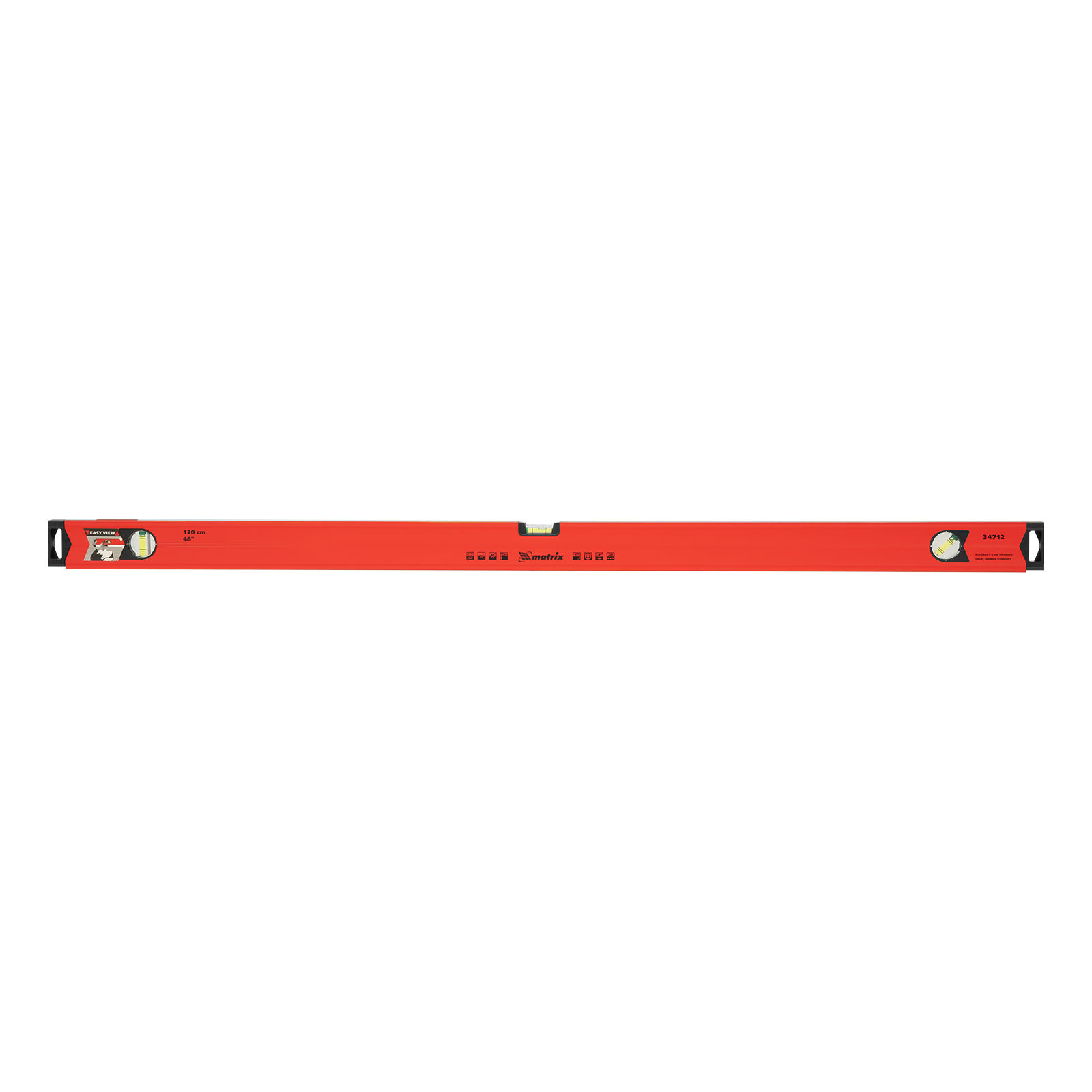 Уровень алюминиевый магнитный Matrix 34712 усиленной конструкции, длиной 1200 мм, с фрезерованной рабочей поверхностью, оснащен 3 глазками и одним зеркальным отражателем. Позволяет выявить отклонения от вертикали, горизонтали и угла 45°. Встроенный зеркальный глазок облегчает считывание показаний.