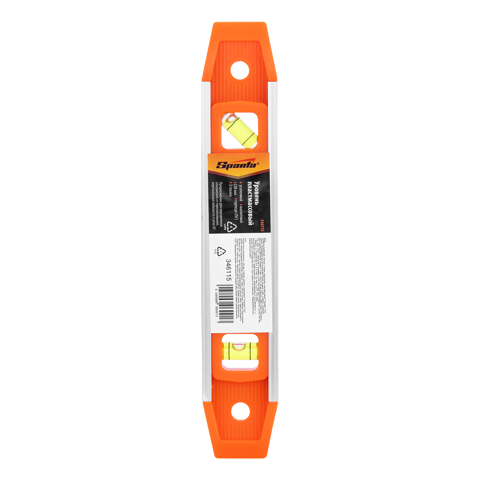 Усиленный магнитный уровень Sparta «Торпедо» (IV) 346115 длиной 230 мм, пластмассовый, с 3 глазками, — оптимальный инструмент для бытового использования. 3 глазка служат для проверки горизонтальных и вертикальных поверхностей, а также соответствия углу 45°. Благодаря небольшой длине инструмент удобен для работы в труднодоступных местах и ограниченном пространстве.