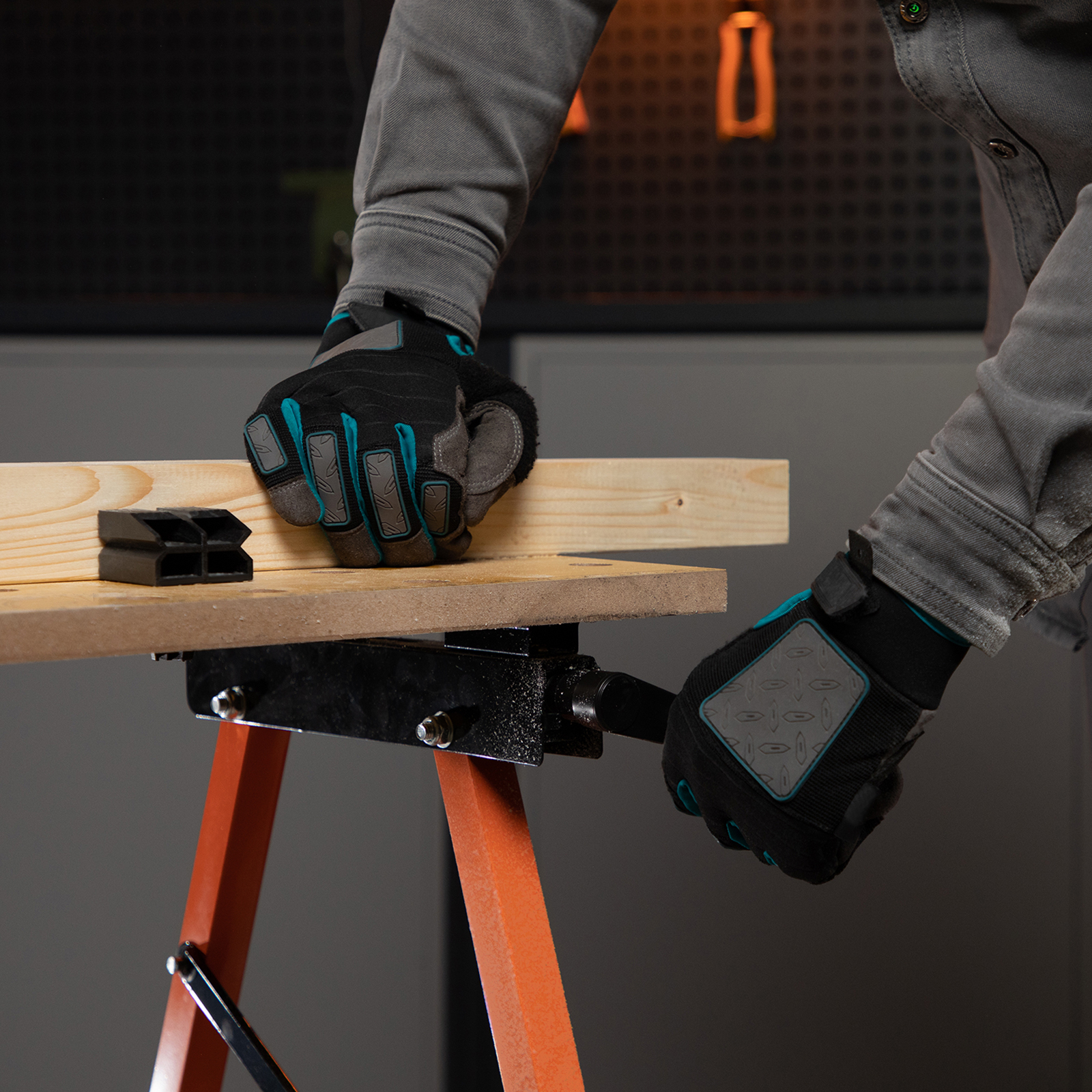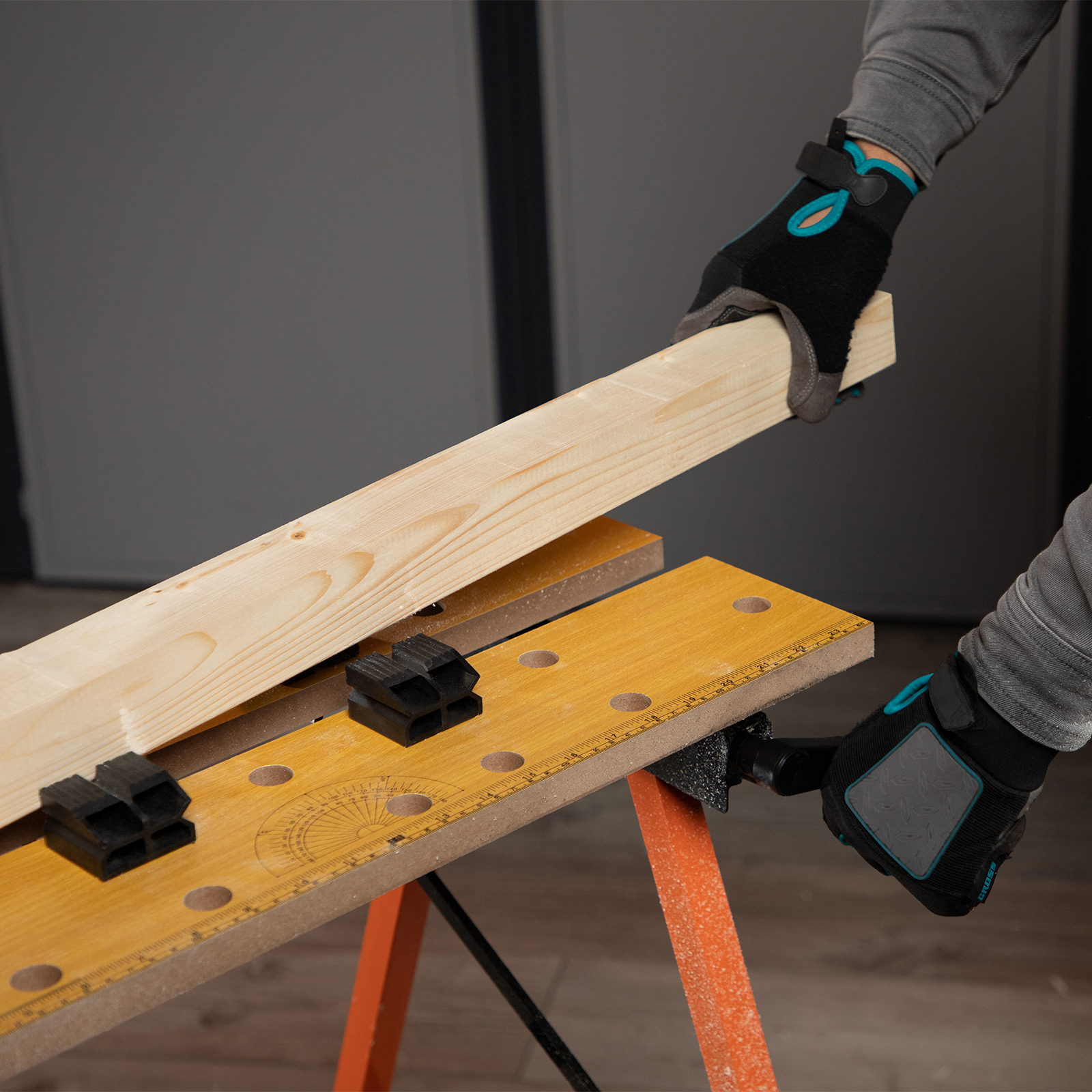 - Удобная эксплуатация — верстак снабжен 4 съемными упорами, которые устанавливаются в различных позициях, а на столешнице имеется разметка с линейкой и транспортиром.