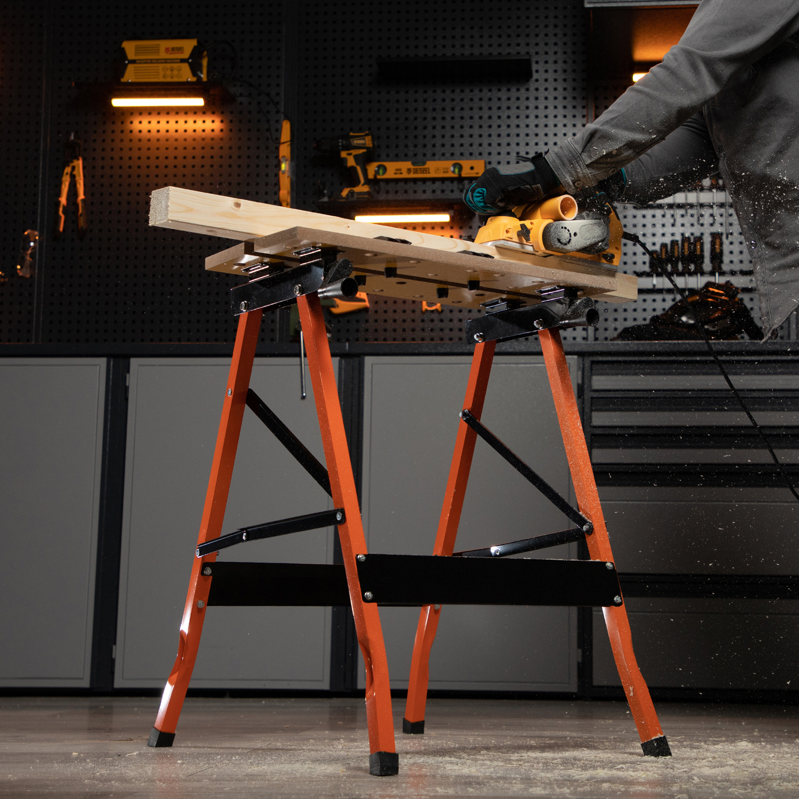 - Компактность — в сложенном виде верстак занимает мало места, его можно хранить без снятия элементов конструкции.