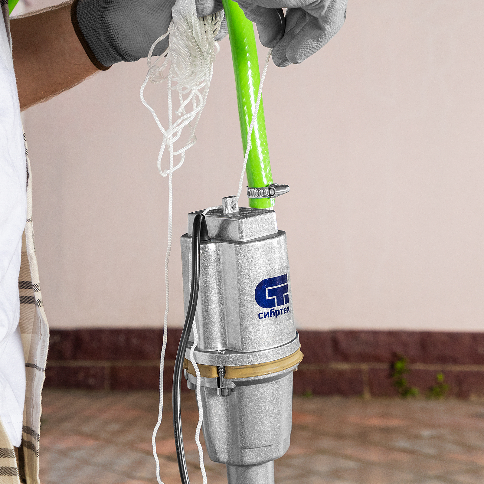- Необходимые аксессуары в комплекте — трос для установки и хомут для подключения шланга прилагаются к насосу.