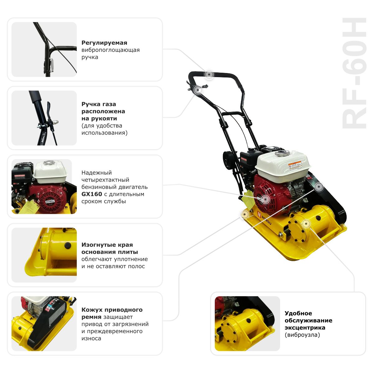 Виброплита NORSU RF-60H — компактная высокоэффективная модель для работ по уплотнению грунтов на глубину до 200 мм. Оборудована двигателем NORSU GX160 мощностью 4800 Вт, имеет широкую сферу применения: строительные, ландшафтные, дорожные работы. Благодаря наличию колес обеспечивается маневренность и возможность быстрого перемещения модели между рабочими участками.