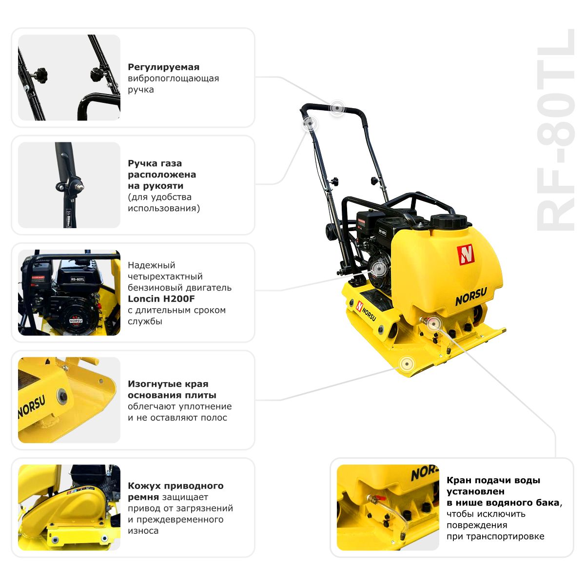 Виброплита бензиновая прямоходная NORSU RF-80TL (колесный комплект, бак для воды) в Краснодаре