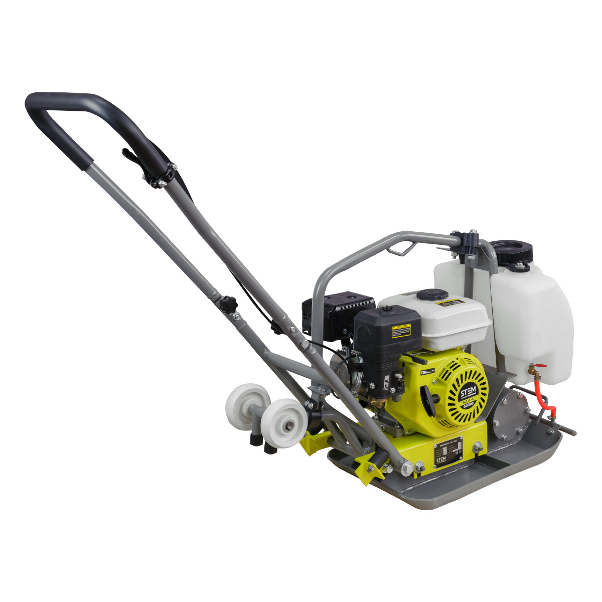 Прямоходная виброплита STEM Techno SPC162E – одна популярных моделей, оборудована баком для воды и его защитным креплением. Есть возможность использовать с резиновым ковриком при укладке тротуарной плитки.