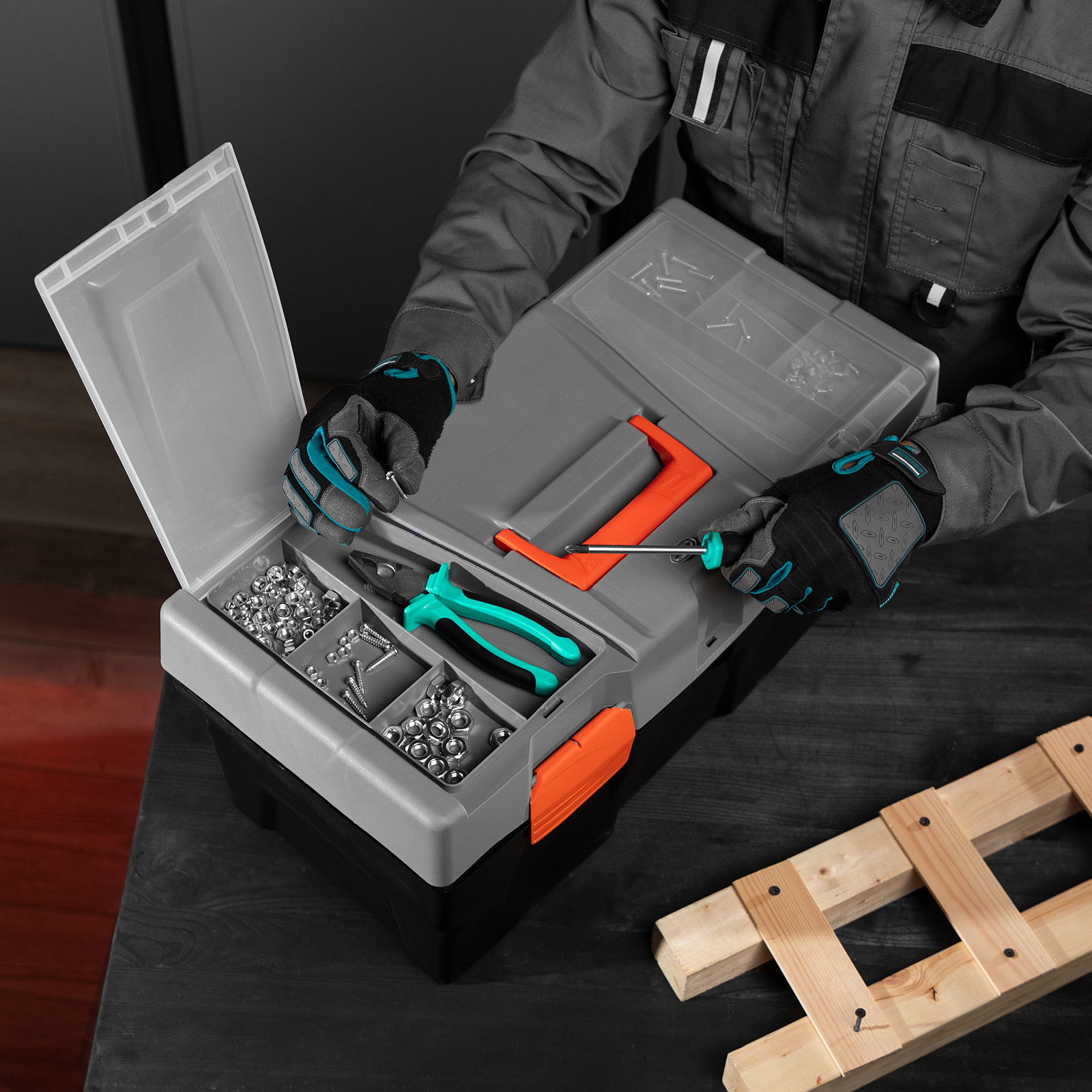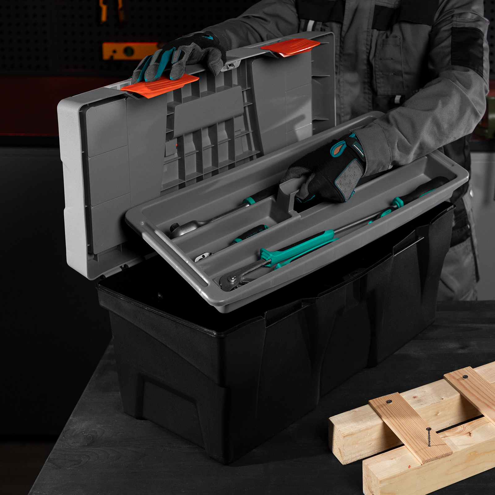 - В ящике имеется съемный лоток, что позволяет удобно расположить инструменты разного размера, а также крепежи и мелкие детали.