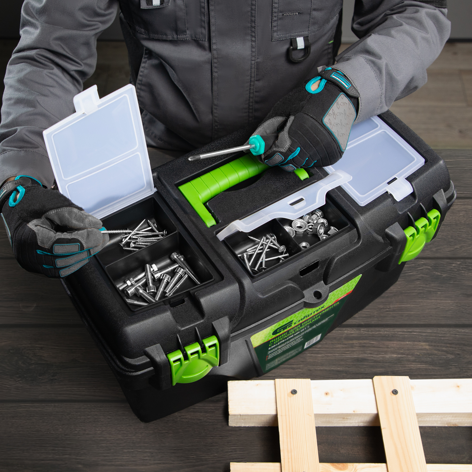 - Удобное хранение крепежа и мелких деталей — в крышке имеются органайзеры.