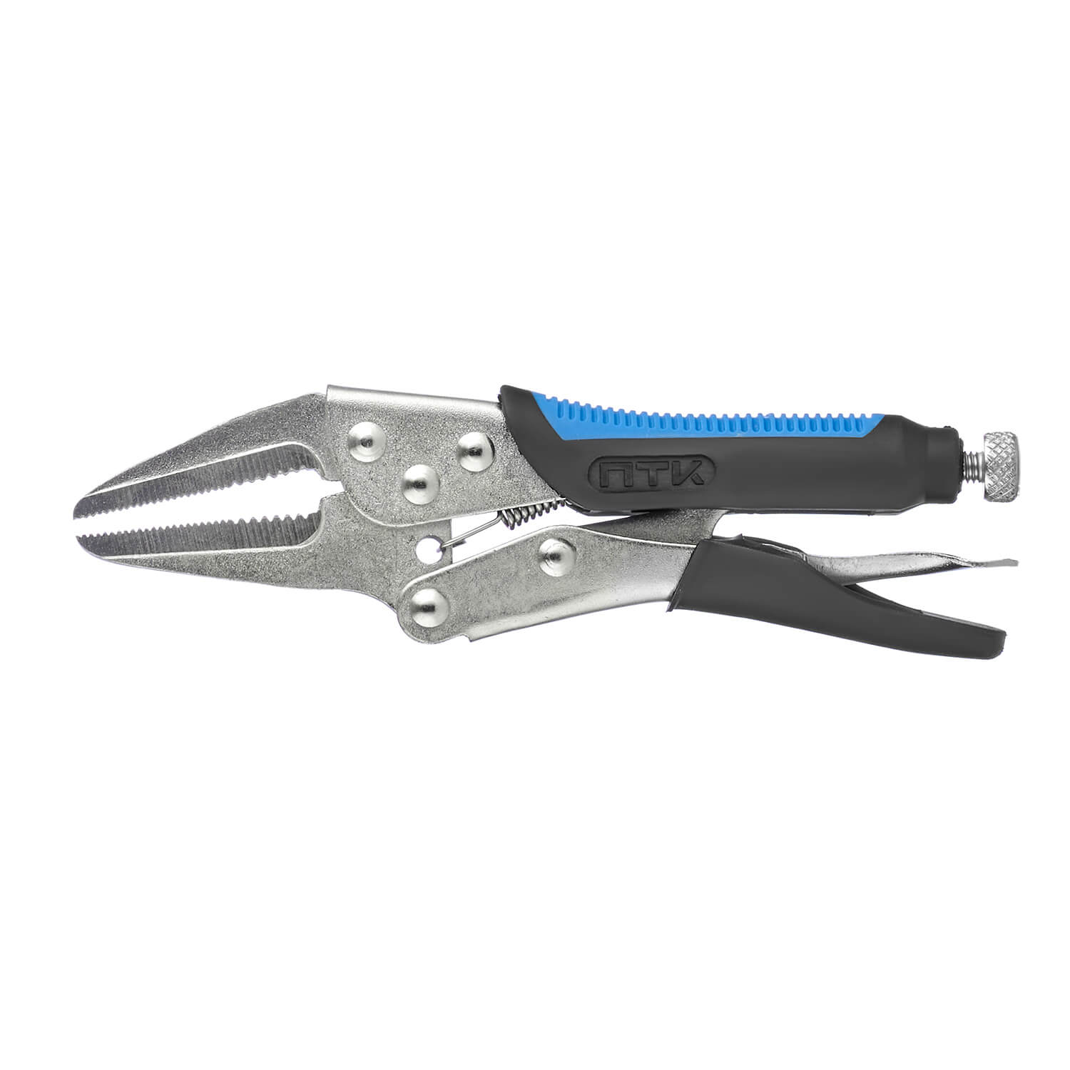 Зажим с губками с насечками и винтом, который расположен на рукоятке и обеспечивает надежную фиксацию при сварке.